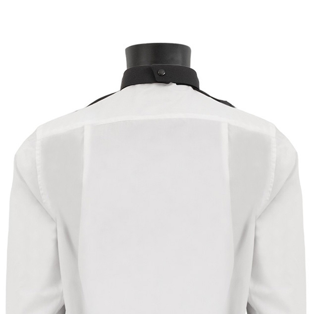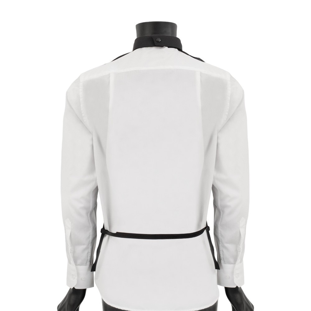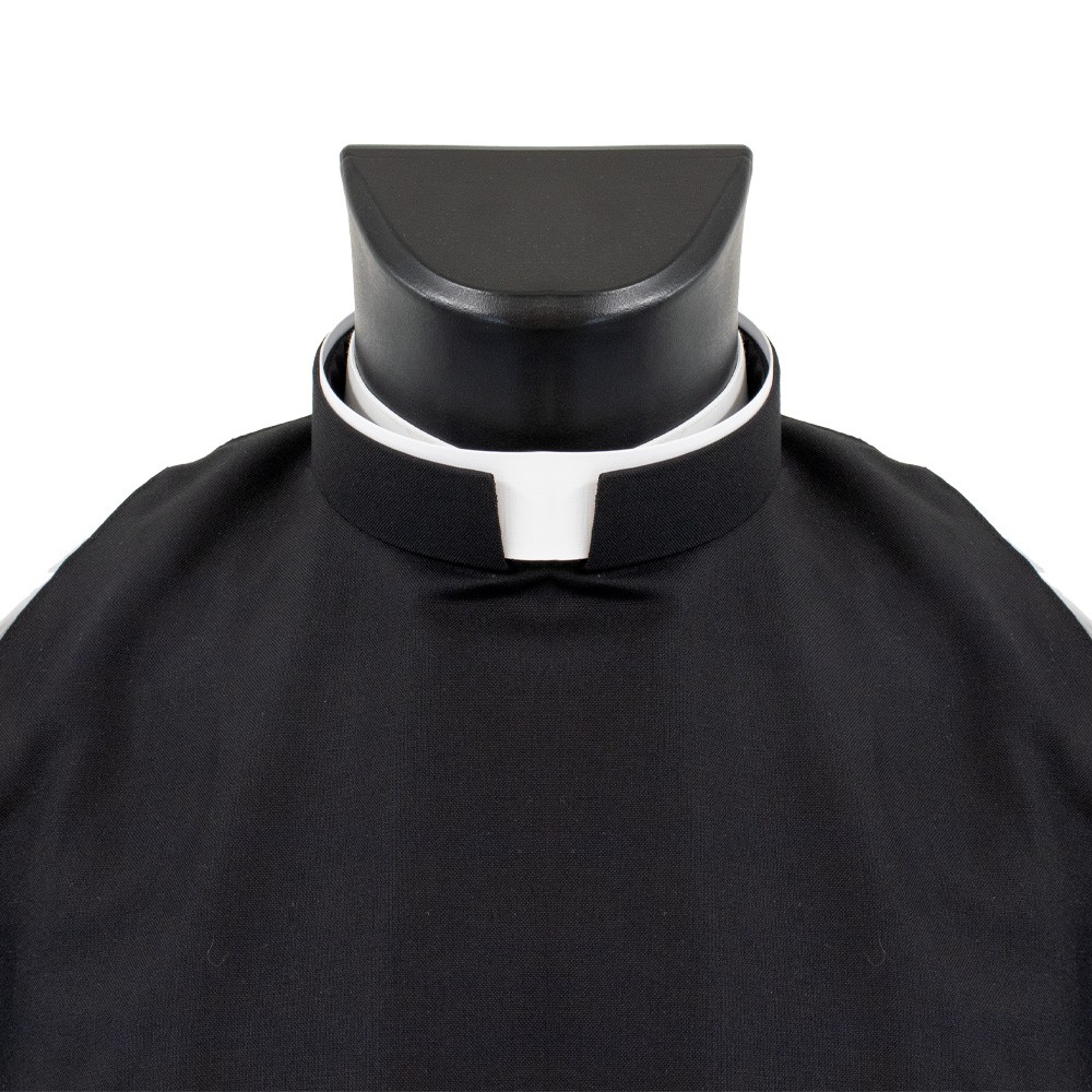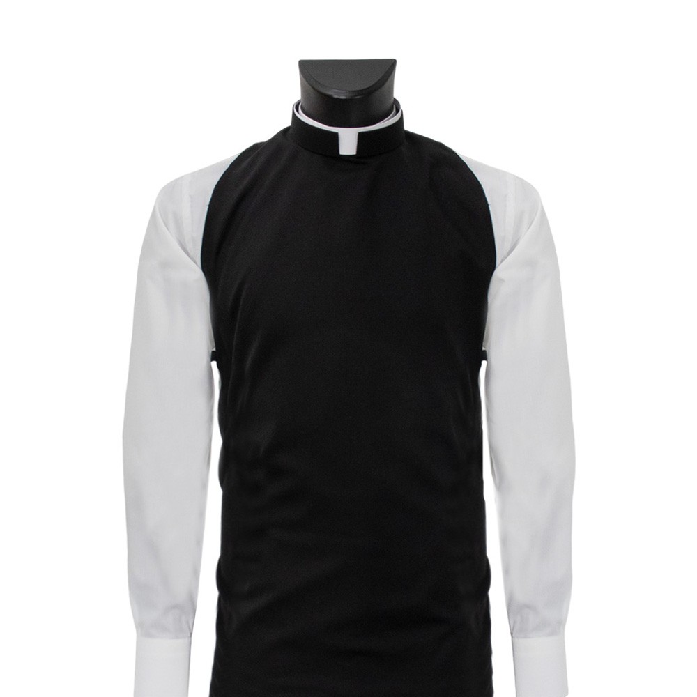 Pettorina liturgica nera con collo romano e elastico a vita regolabile.
