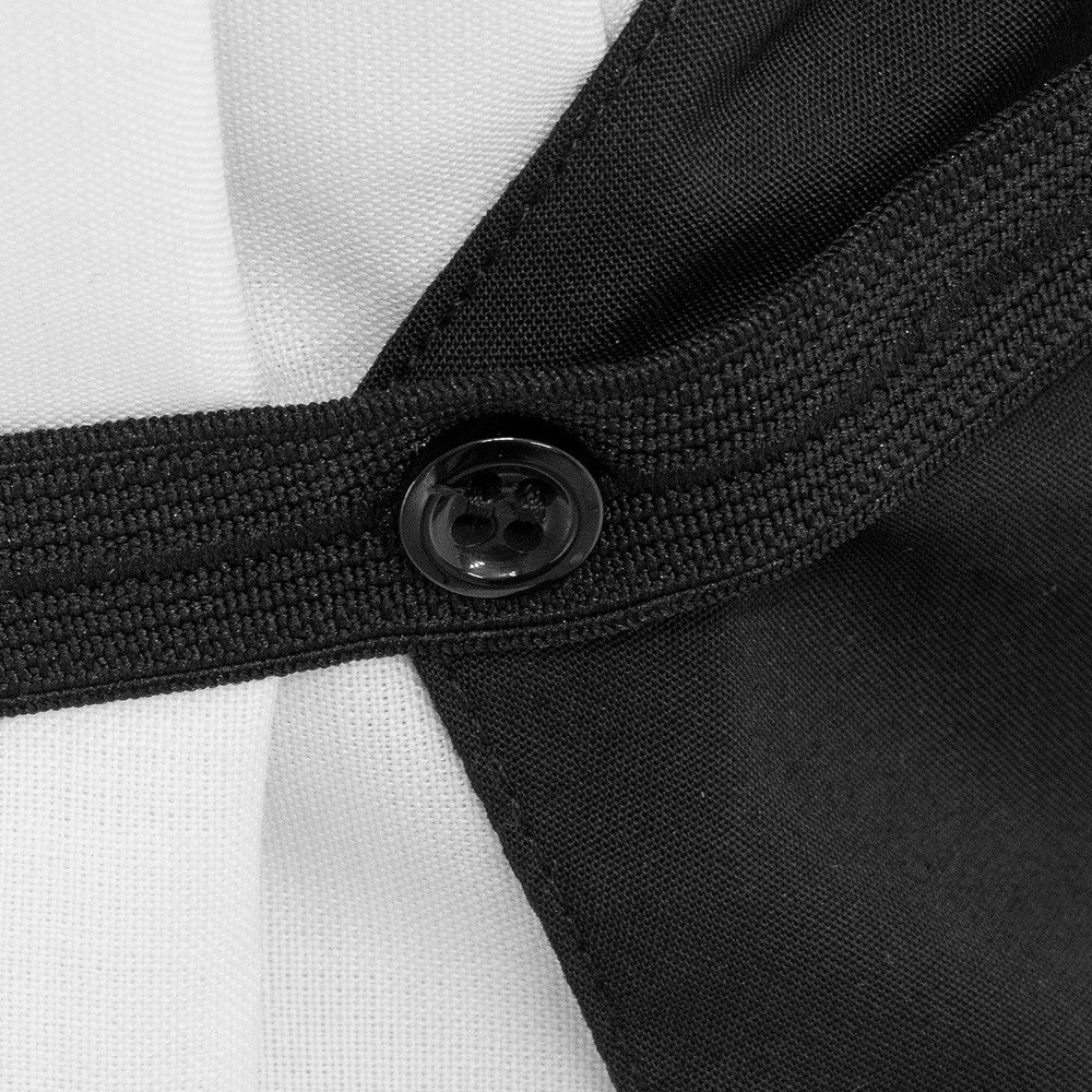 La pettorina è realizzata in tessuto misto 65% poliestere e 35% cotone, con chiusura sul collo ed eleastico a vita regolabile.