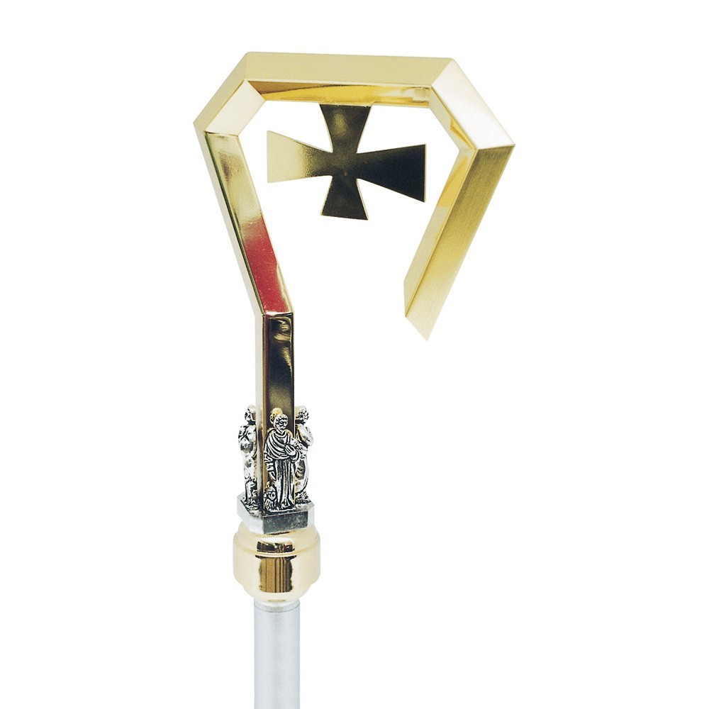 Questo bastone pastorale è un articolo sacro realizzato in ottone dorato ed è completo di asta. Il bastone pastorale è sagomato con croce centrale ed è decorato con i simboli dei quattro evangelisti. Dispone di un'asta alta 150 cm divisibile in tre pezzi da 50 cm.