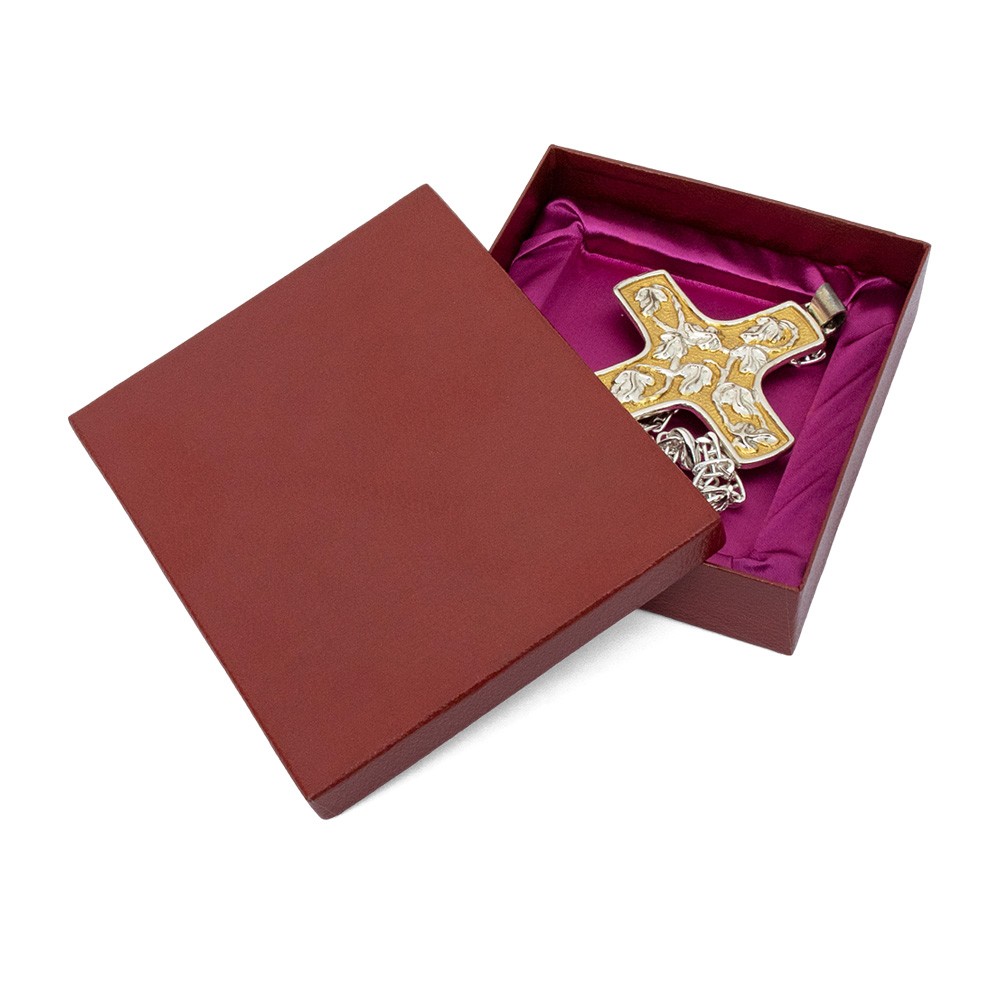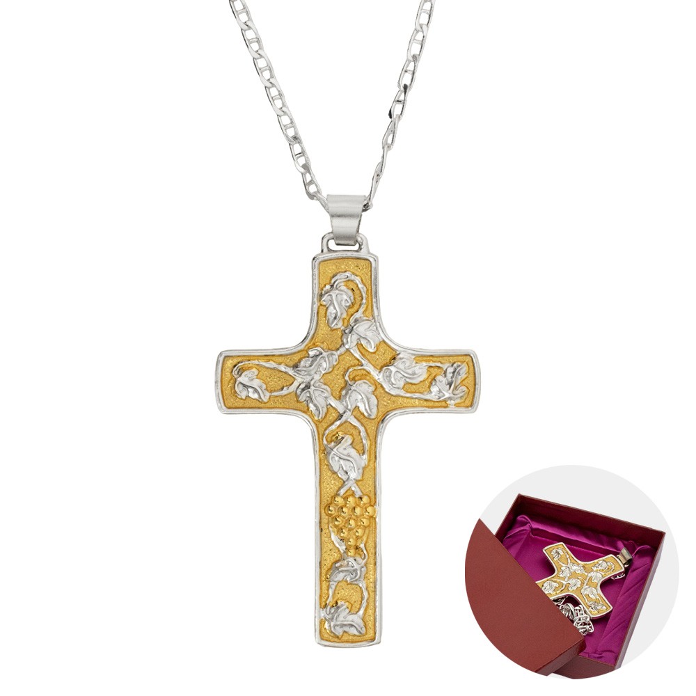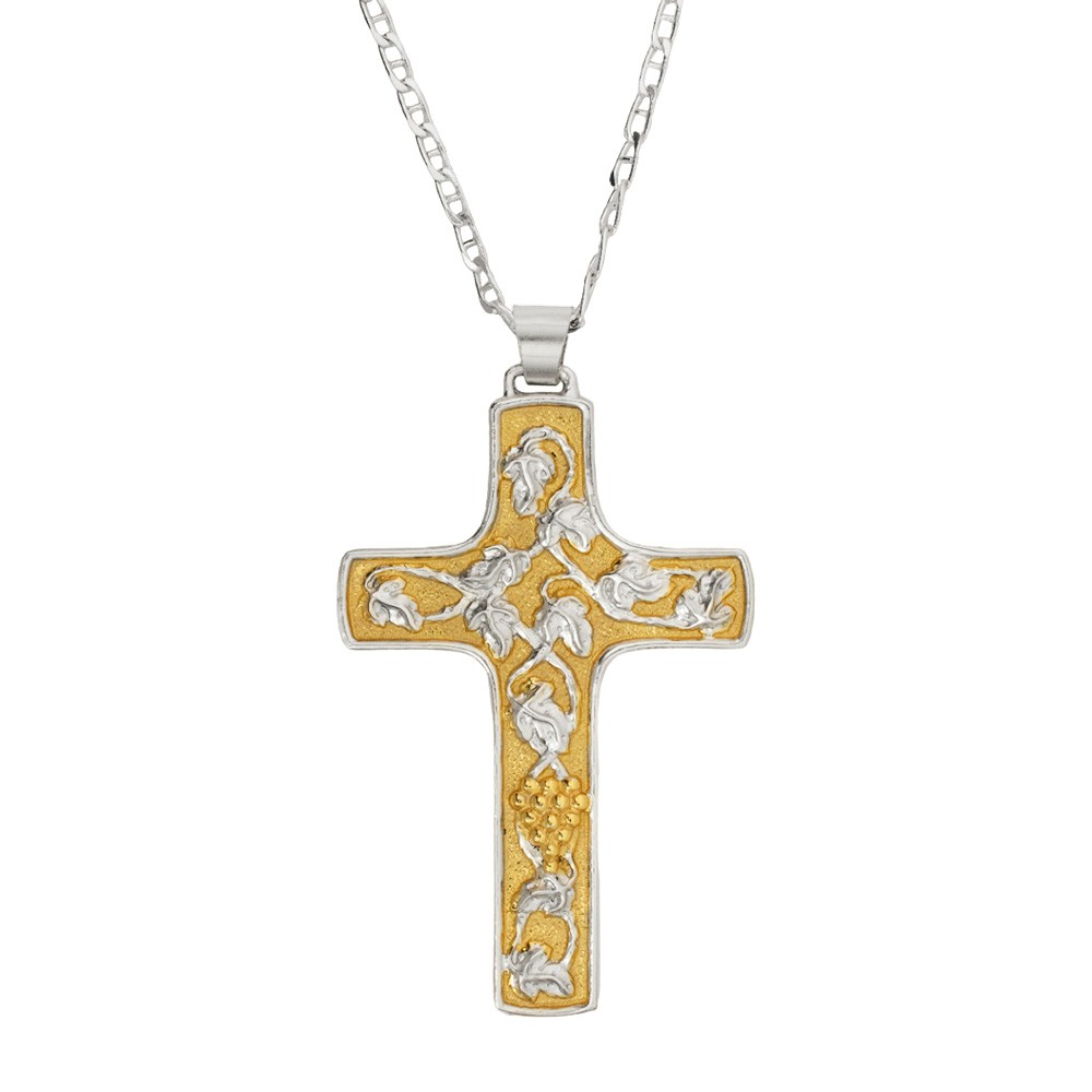 La croce è finemente decorata con tralci d'uva ed è munita di moschettone per la chiusura.