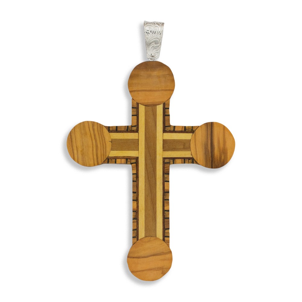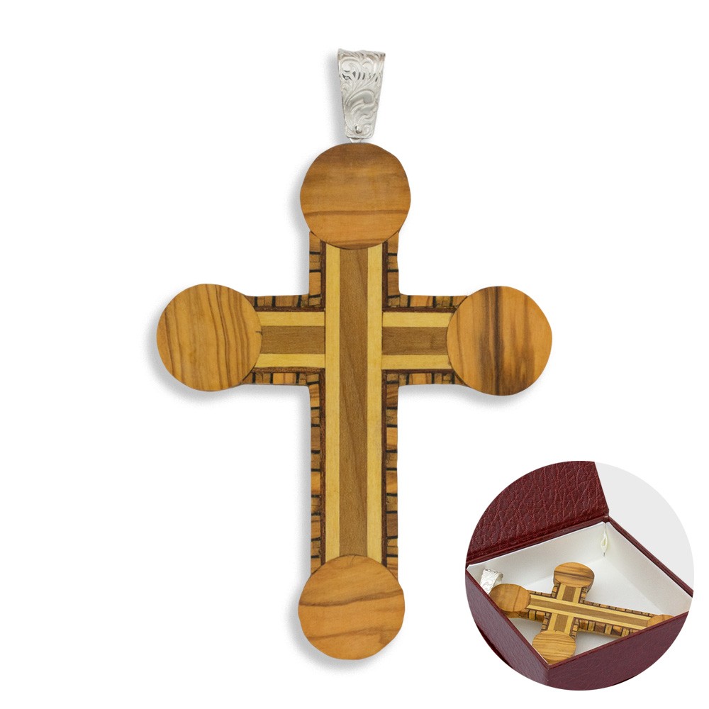 La Croce pettorale è realizzata in legno intarsiata con gancio in argento.