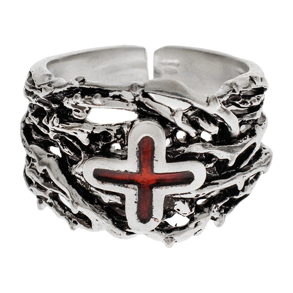 Anello vescovo regolabile realizzato interamente in argento 925 e arricchito con croce smaltata di colore rosso.