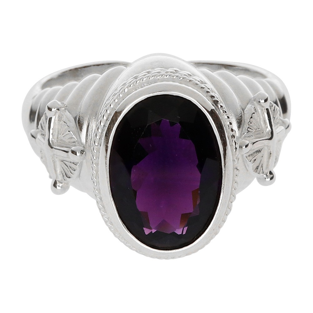 Anello vescovile con pietra ametista, realizzata interamente in argento 925 con finitura color argento.