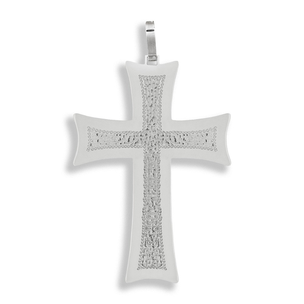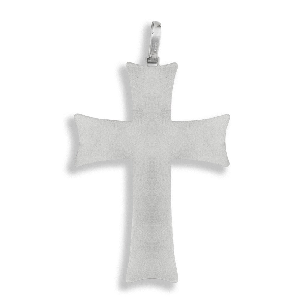 Questa preziosa croce vescovile è in argento 925 lucido, realizzata interamente a mano, con eleganti decori posti al centro della croce.