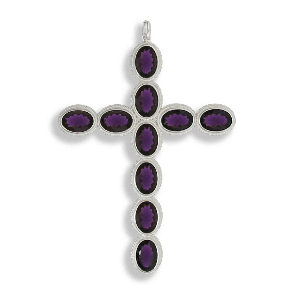 Meravigliosa croce pettorale per vescovo realizzata interamente in argento 800 e impreziosita da eleganti strass ovali color ametista.