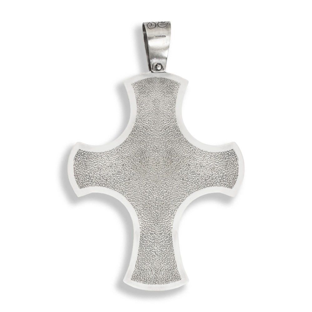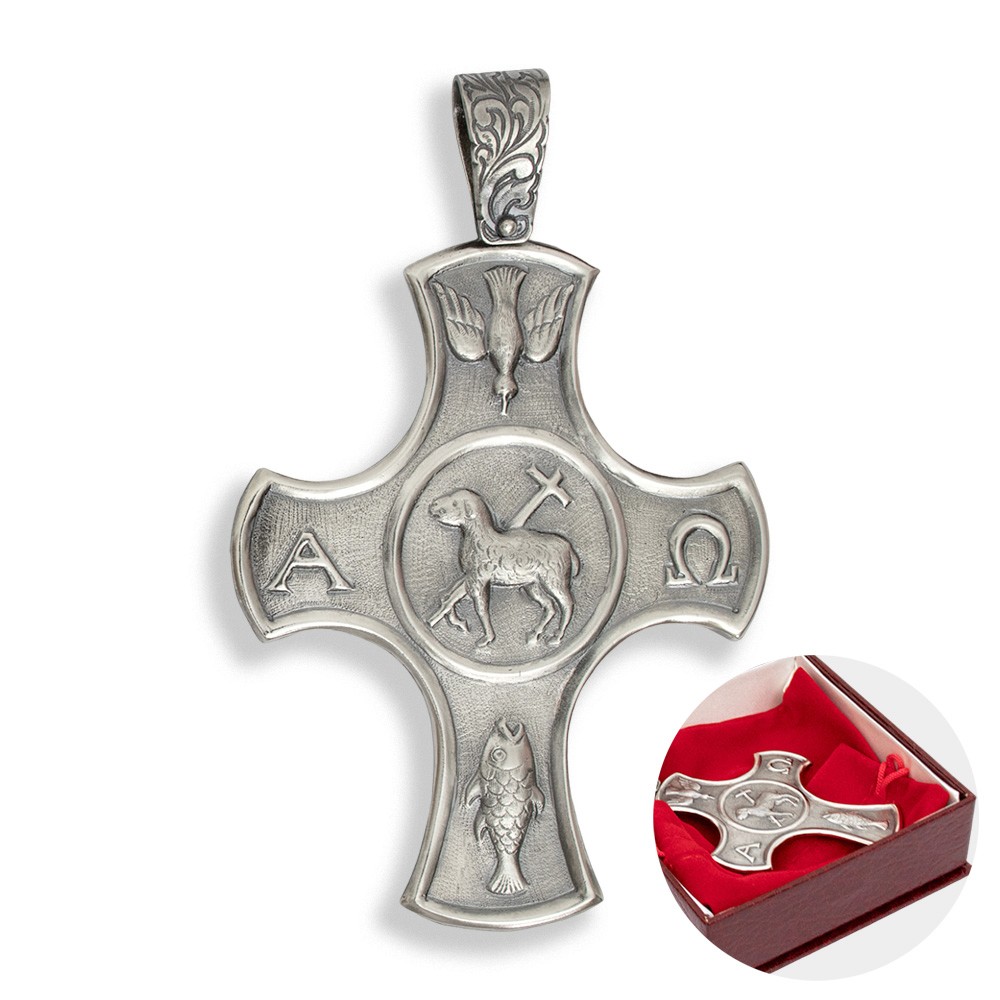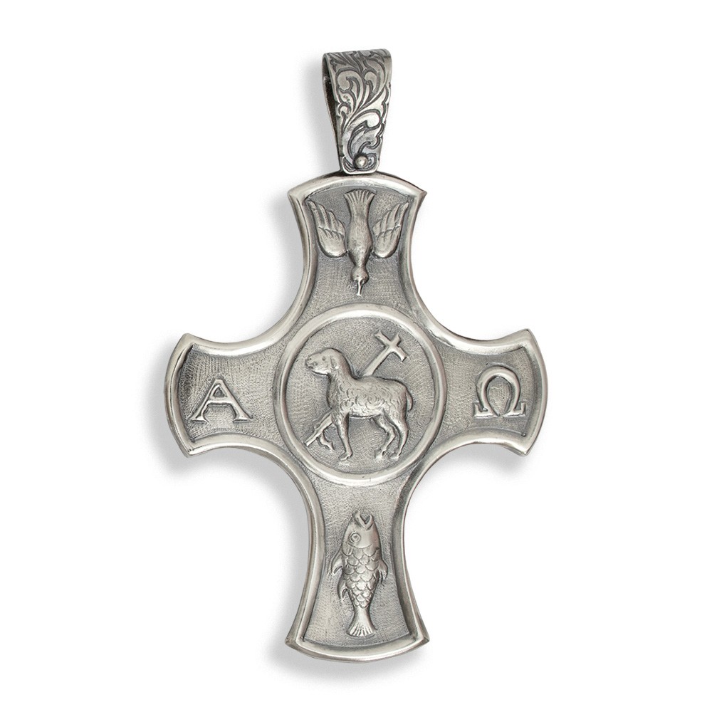 Pregiata croce vescovile realizzata interamente in argento 925, al centro vi è raffigurato l'agnello pasquale e alle quattro estremità i simboli Alfa e Omega, pesci e colomba (spirito Santo).