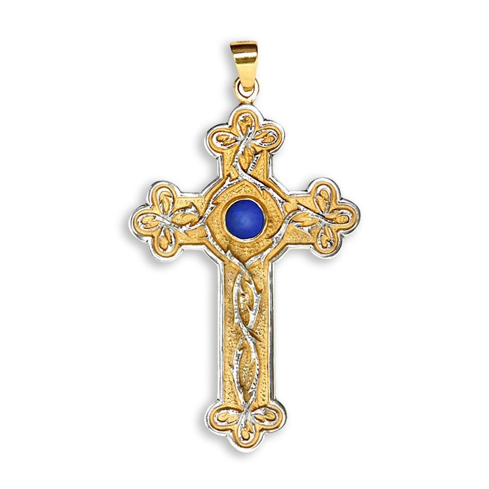 Croce pettorale in argento 925 con pietra di colore blu posta al centro della croce. Misura 10x6 cm.