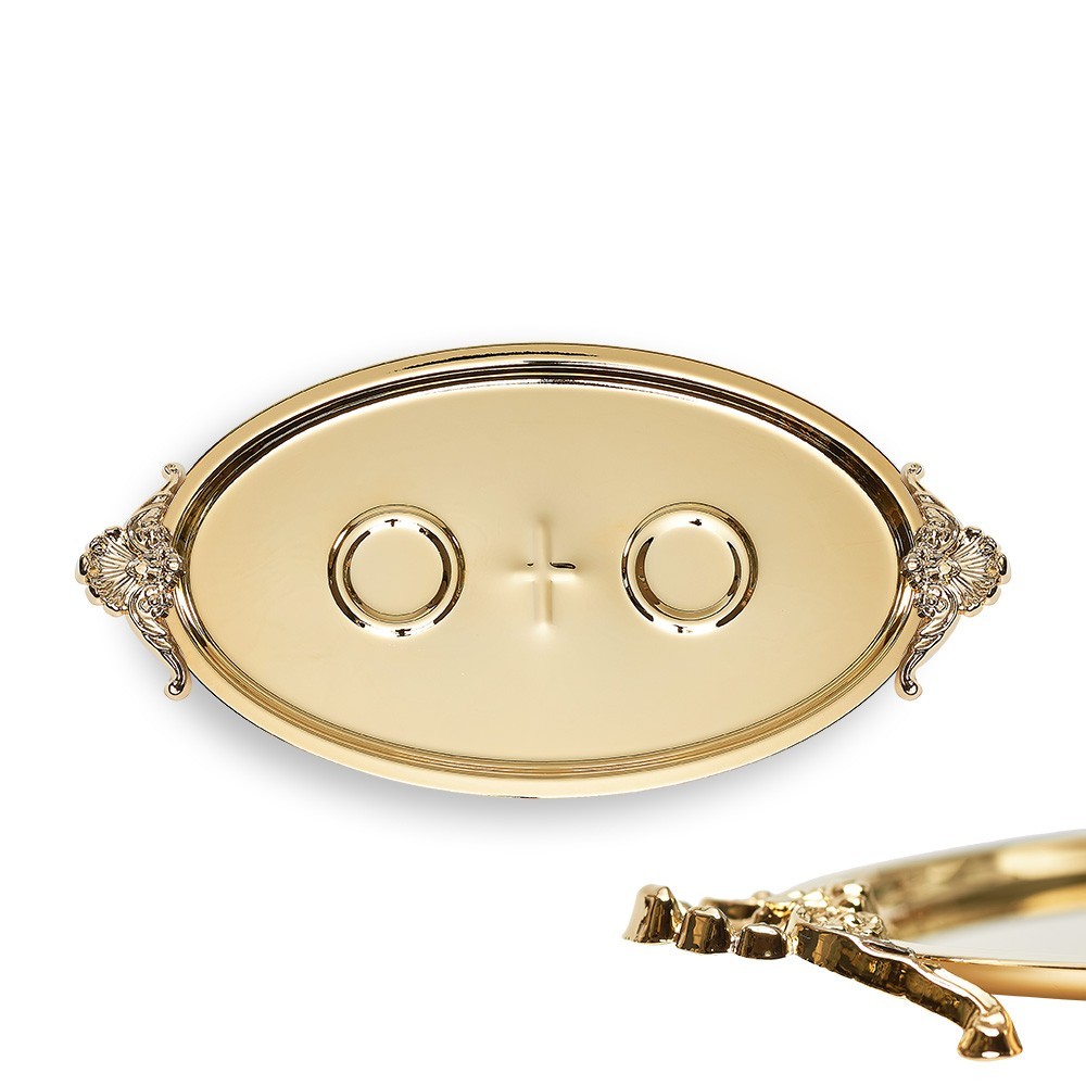 Vassoio per gli sposi in ottone dorato. I manici fungono da piedini, all'interno degli incavi per le fedi, vi si può inserire un'applicazione in raso bianco.