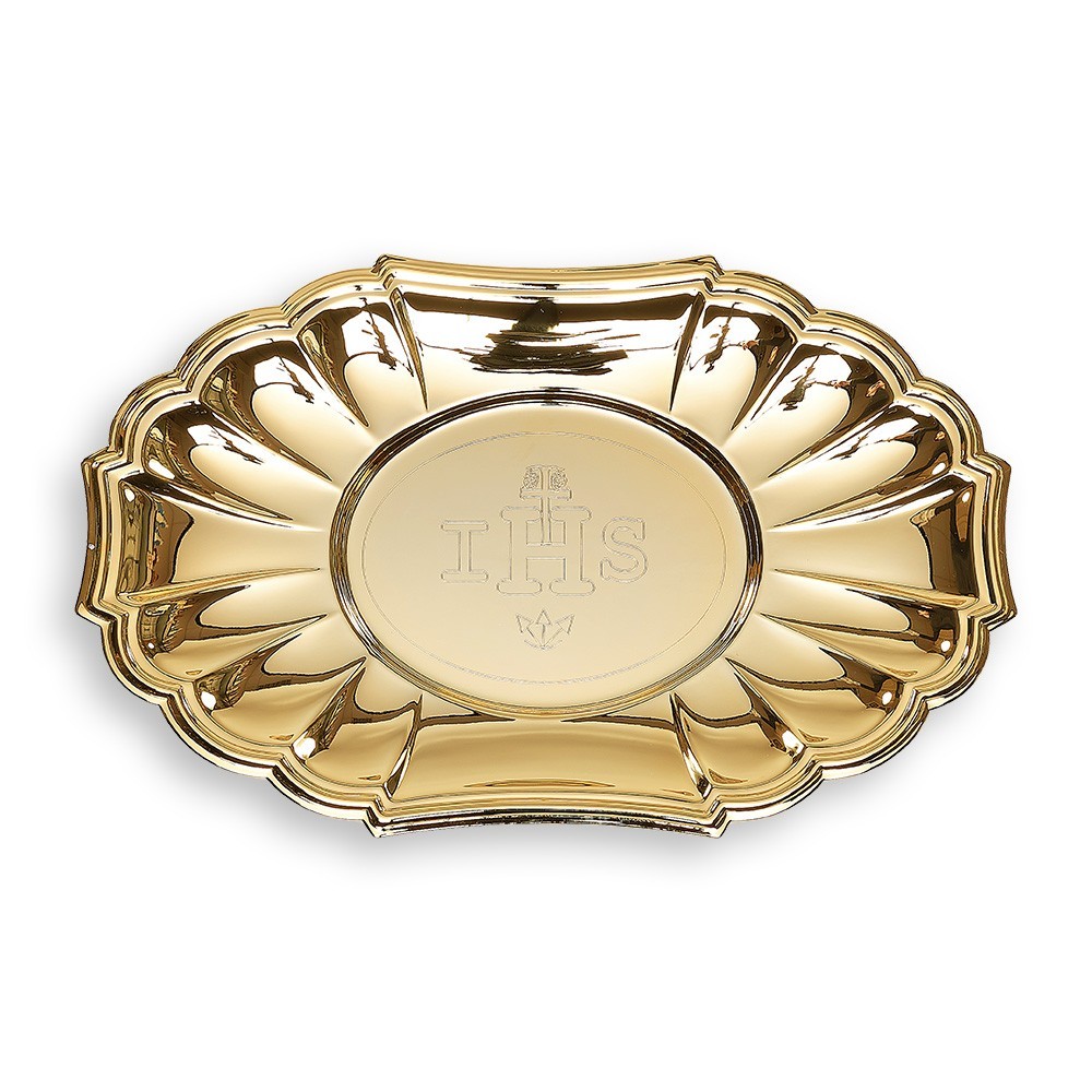 Piatto in ottone dorato per distribuire la comunione. Il vassaio è in stile barocco di forma ovale, con incisione nella parte centrale del simbolo IHS. Prodotto 100% italiano.