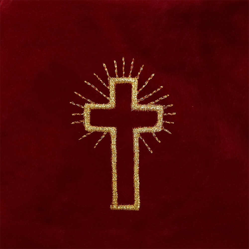Borsa per elemosine realizzata in tessuto floccato rosso con croce ricamata con filati dorati. L'interno del sacchetto è interamente foderato in raso rosso.