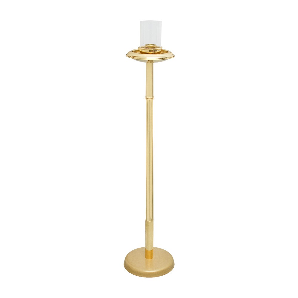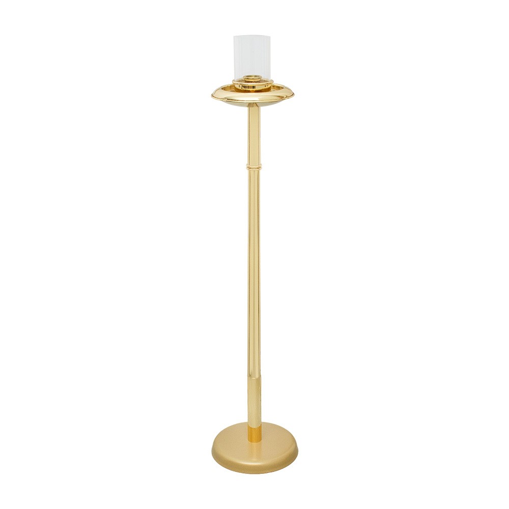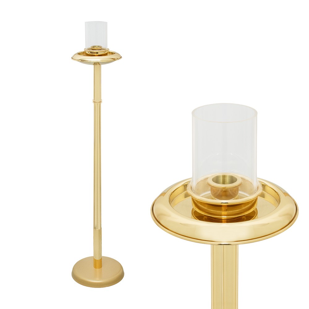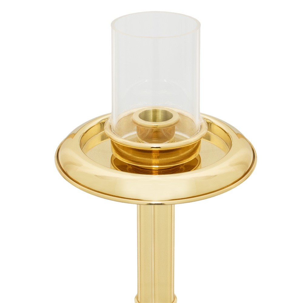 Torcia da processione realizzata in ottone dorato, completa di parafiamma e base.