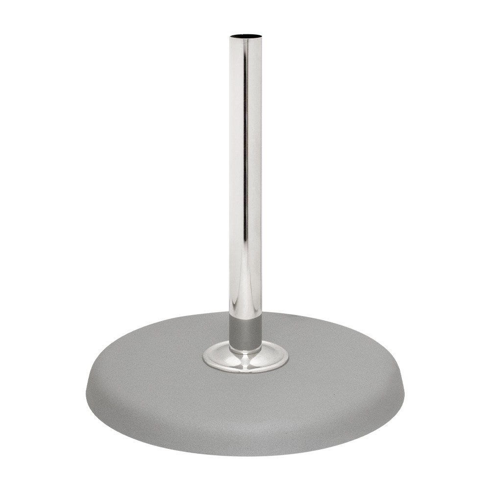 Questa base per asta stendardo è realizzata in metallo opaco, il diametro misura 26 cm, mentre l'asta è in metallo nichelato (diametro 2,5 cm).