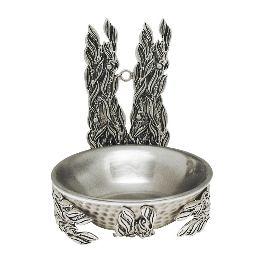 Acquasantiera in ottone argentato con contenitore in alluminio per l'acqua santa. Sul fondo dell'acquasnatiera sono raffigurati due ulivi e attorno alla vasca per l'acqua vi sono altre foglie di ulivo, finemente rifinite.