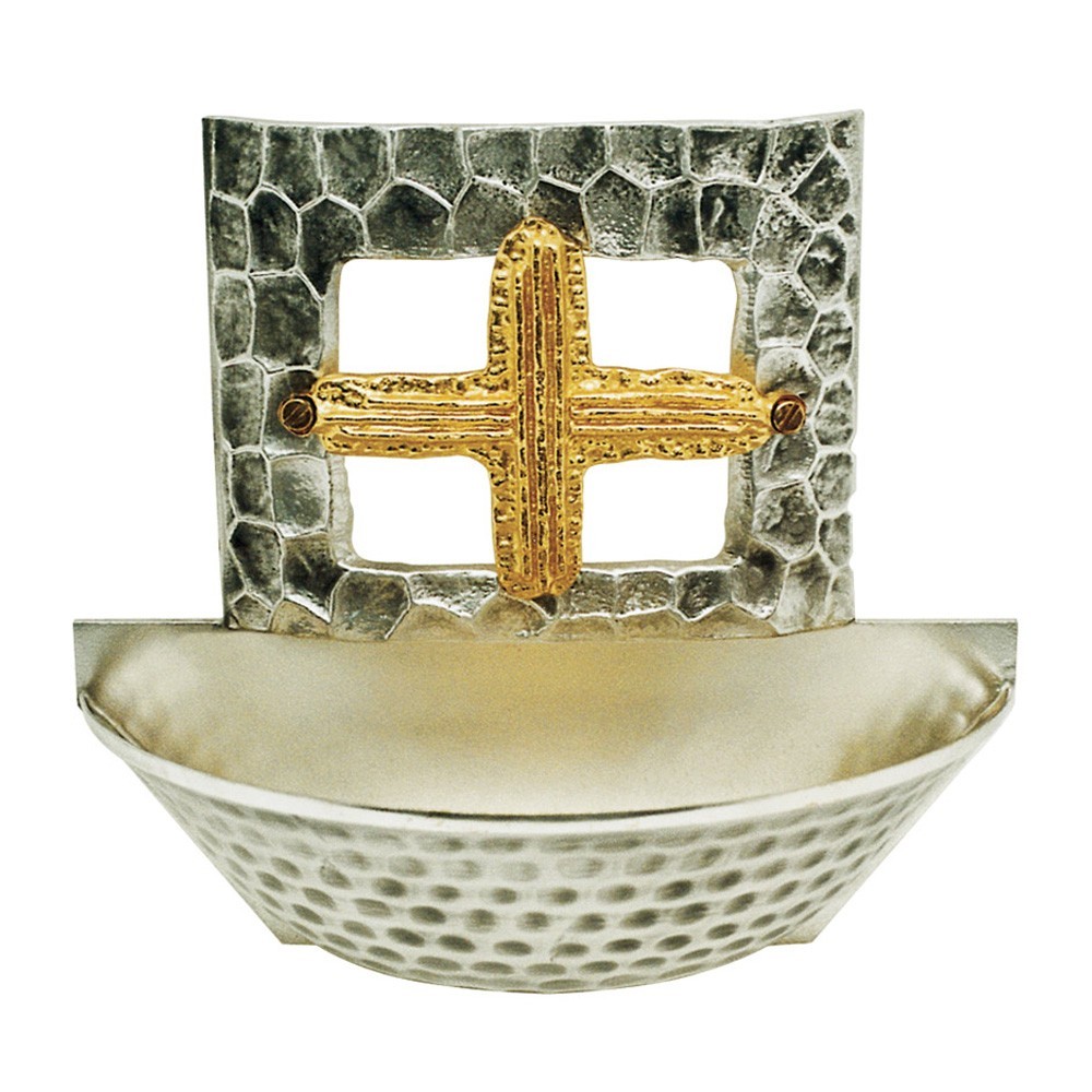 Questa acquasantiera sacra è decorata in modo artigianale, sul fondo vi è una croce in oro che risalta su di una parete rocciosa argentata. Realizzata in ottone con contenitore in plastica per l'acqua santa.