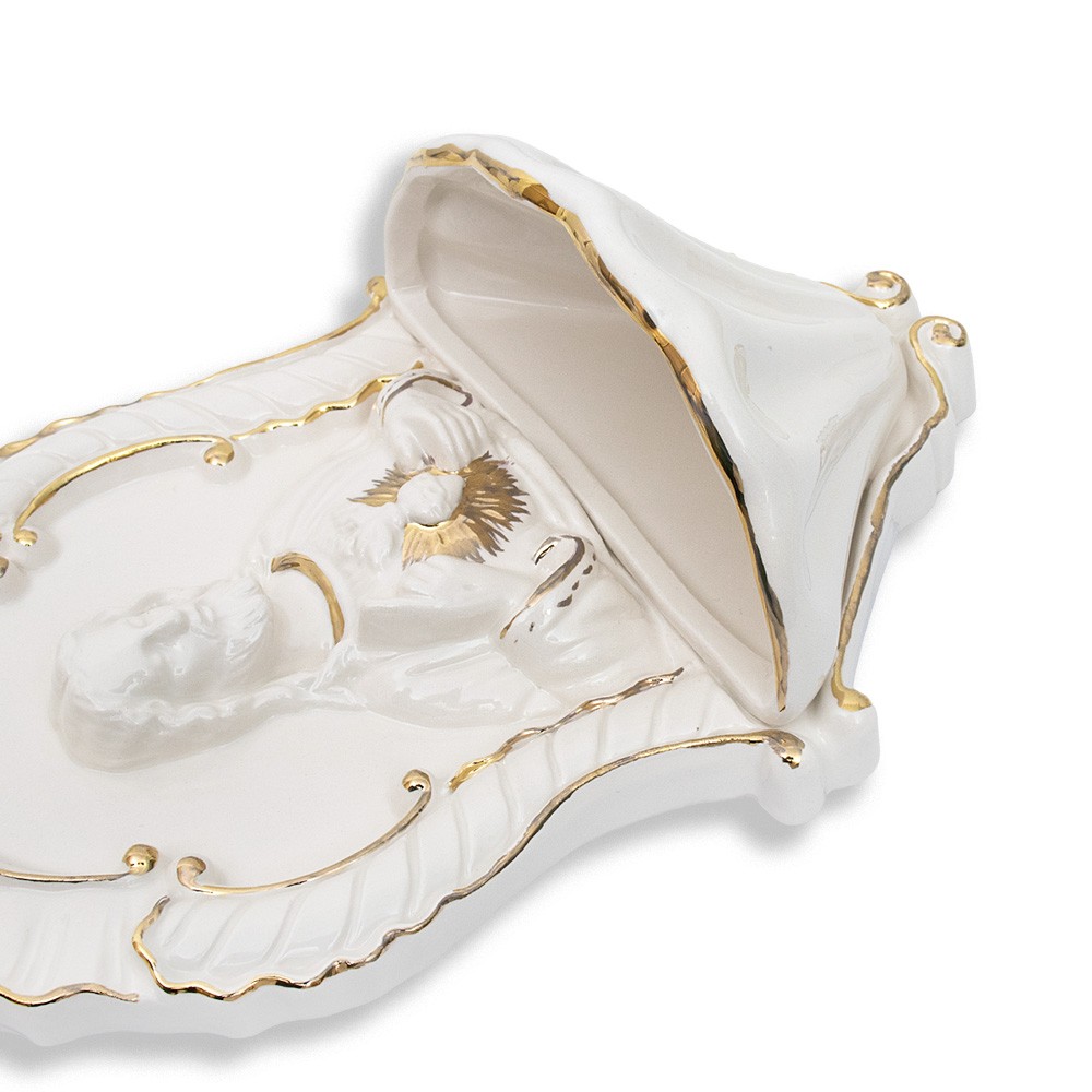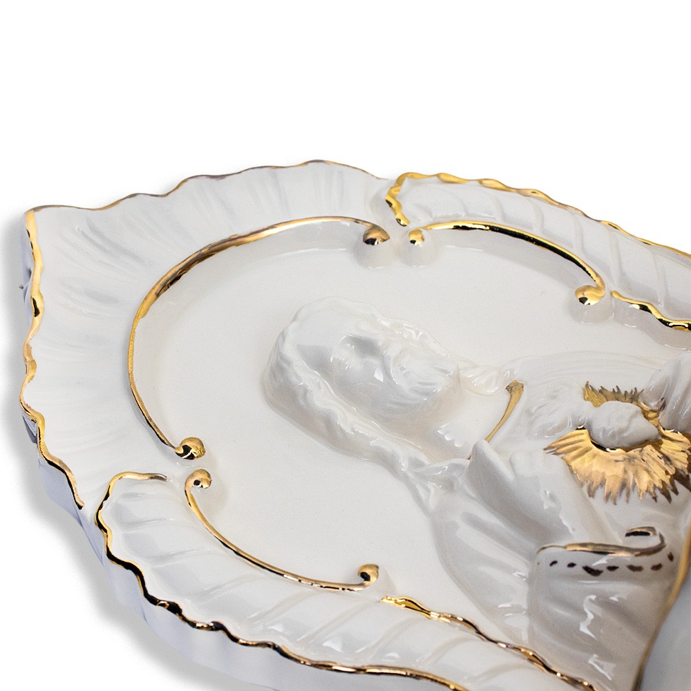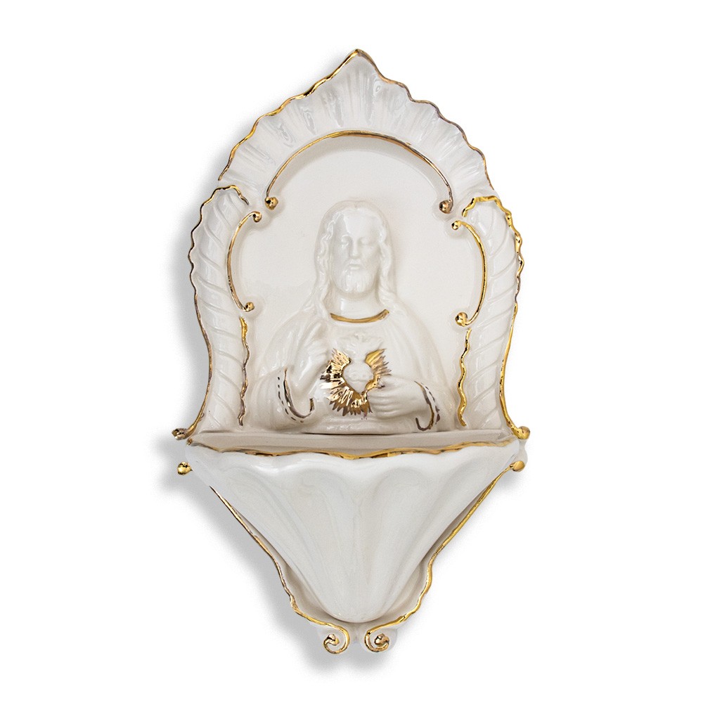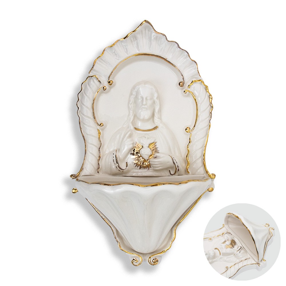 Acquasantiera in ceramica bianca e dettagli in oro, raffigurante il Sacro Cuore di Gesù.