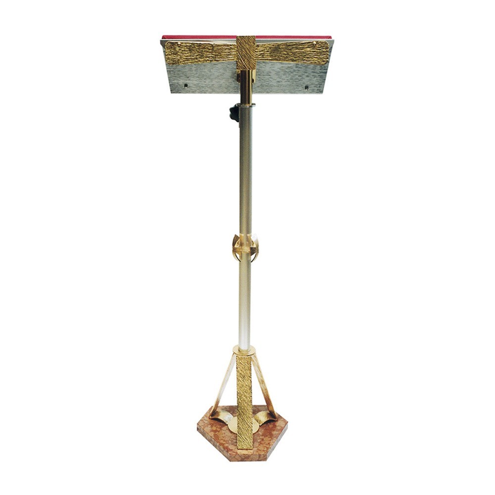 Questo leggio a stelo è regolabile in altezza, è in ottone bicolore con base in marmo. La lavorazione è un graffiato diagonale che interessa la base, il nodo centrale e il frontale del piano di appoggio. Viene fornito completo di cuscino rosso.