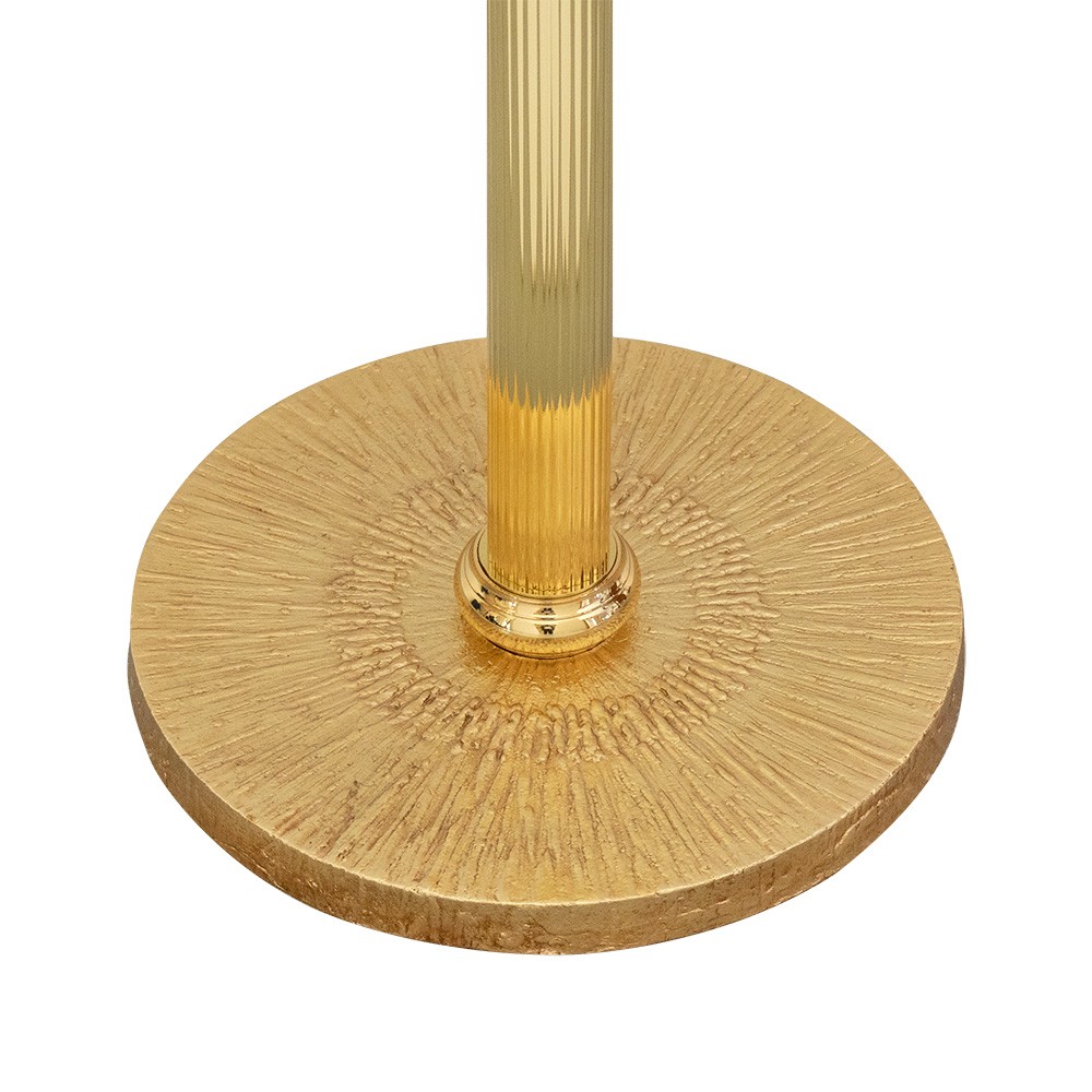 La colonna è realizzata in ottone dorato con base tonda rigata, mentre il piano d'appoggio è interamente in plexiglass. Il piano è fissato su una croce in ottone dorato.