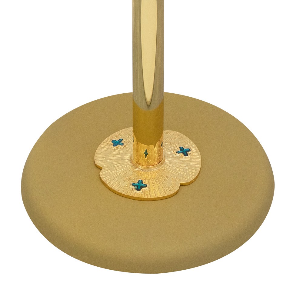 La colonna è in ottone finitura oro con base tonda in metallo decorata con applicazioni di pietre blu, mentre il piano d'appoggio è interamente in plexiglass. Il piano è fissato su una croce piatta in ottone.