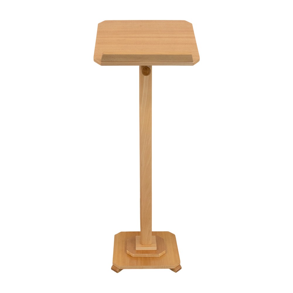 Il piano d'appoggio presenta bordi sagomati e la colonna centrale è regolabile in altezza per adattarsi a diverse esigenze durante la celebrazione. L'articolo è rifinito con cura e realizzato in Italia da un'azienda specializzata in arredi sacri.