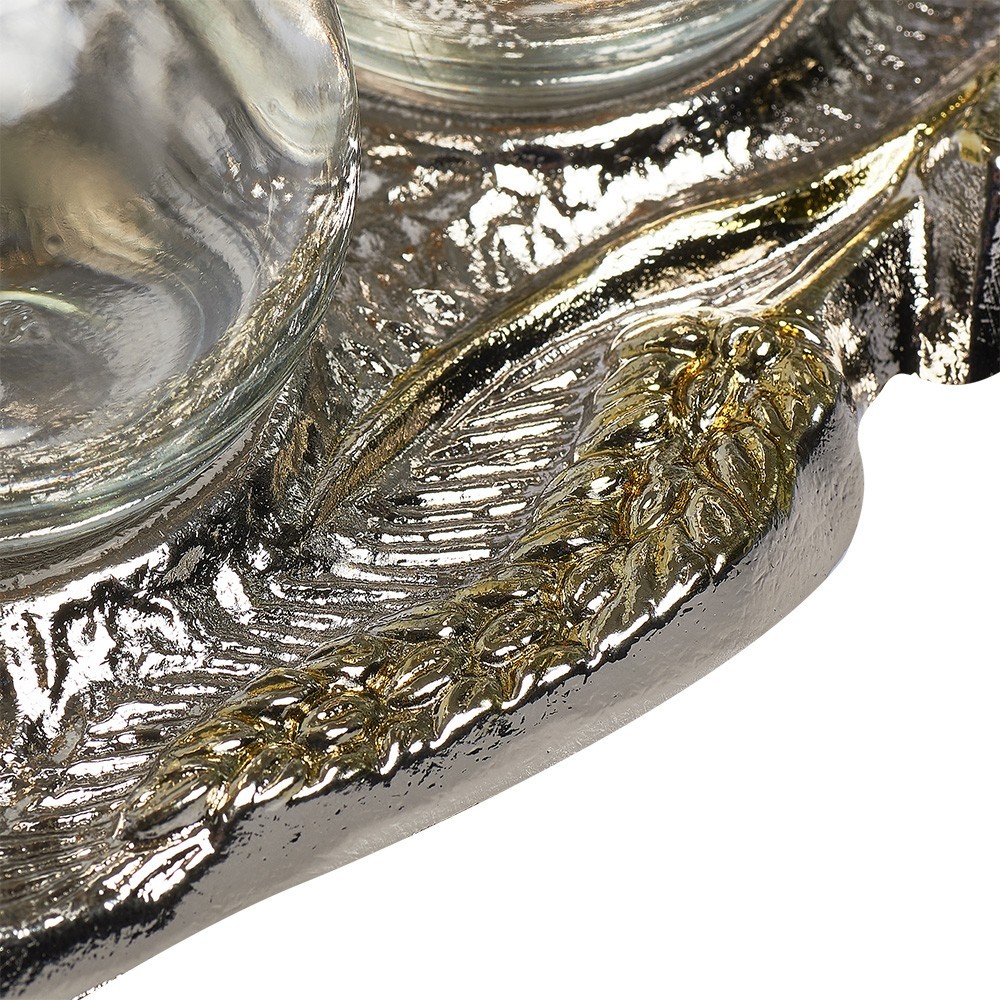 Set ampolline acqua e vino in vetro con vassoio. Il vassoio è in ottone fusione bicolore, finemente decorato.