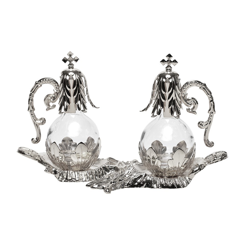 Servizio ampolline per altare acqua e vino con vassoio in ottone.