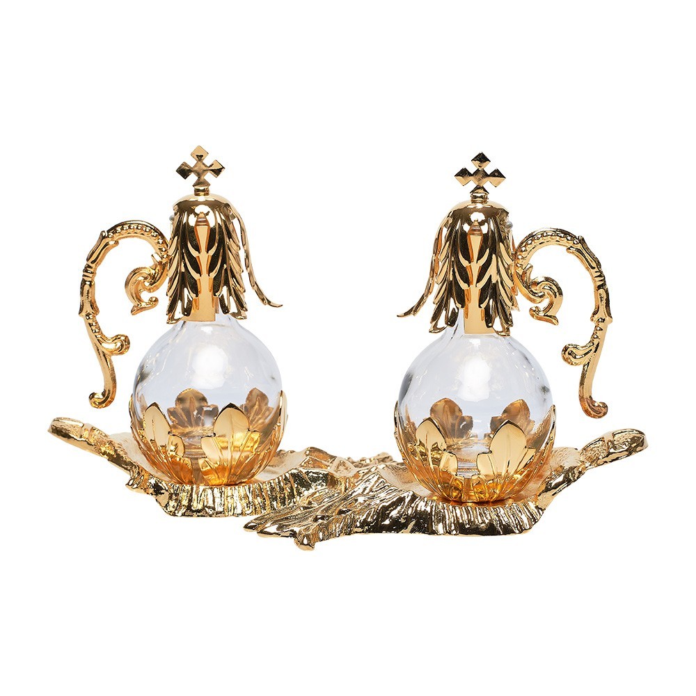 Ampolle liturgiche acqua e vino con vassoio cesellate a mano.