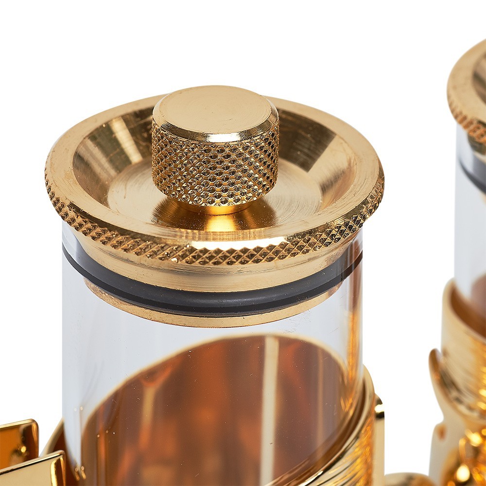 Servizio di ampolline ermetiche su vassoio in ottone dorato.