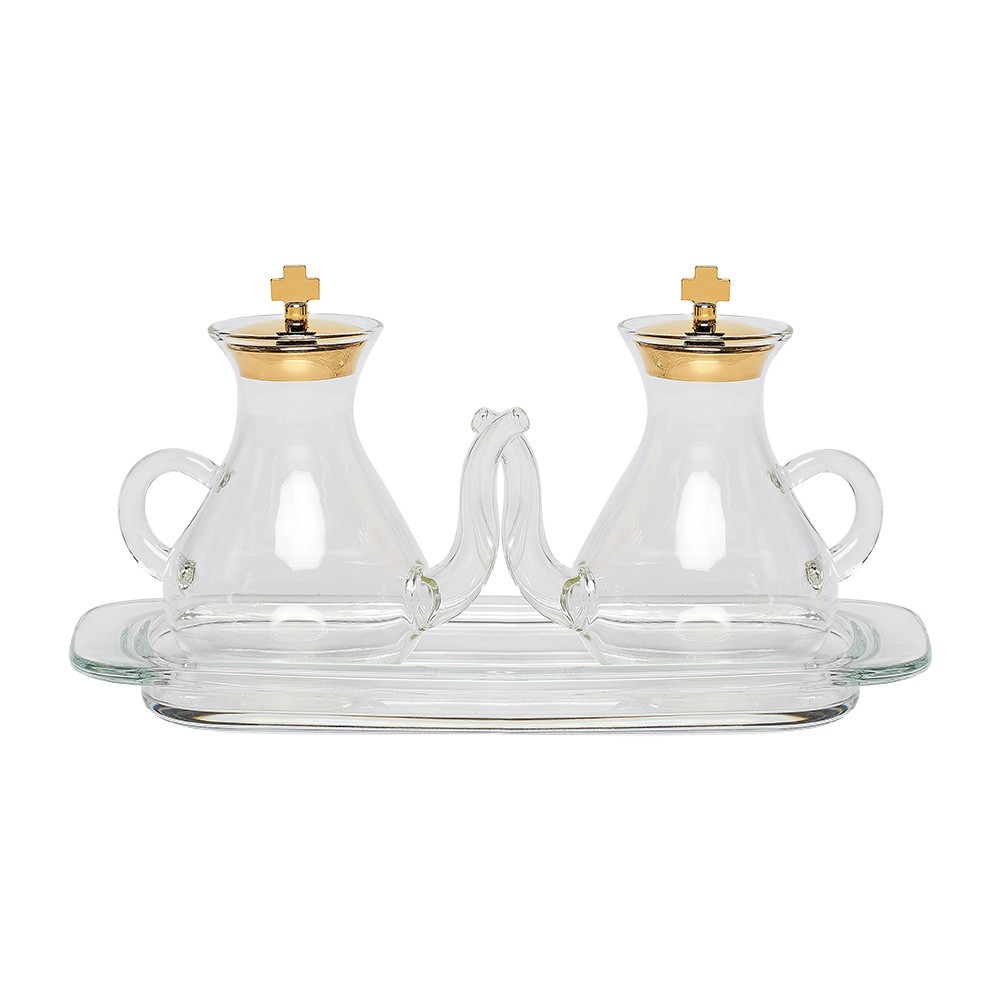 Servizio ampolline per altare acqua e vino con piatto in ottone.