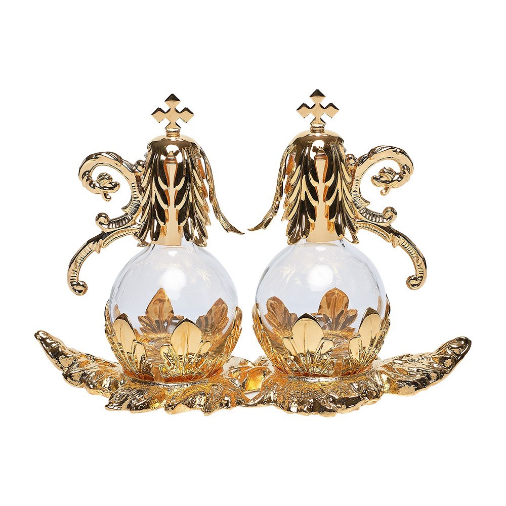 Ampolle liturgiche acqua e vino in vetro decorate a mano.