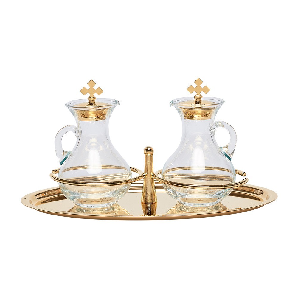 Set Liturgico completo di vassoio e ampolline acqua e vino.