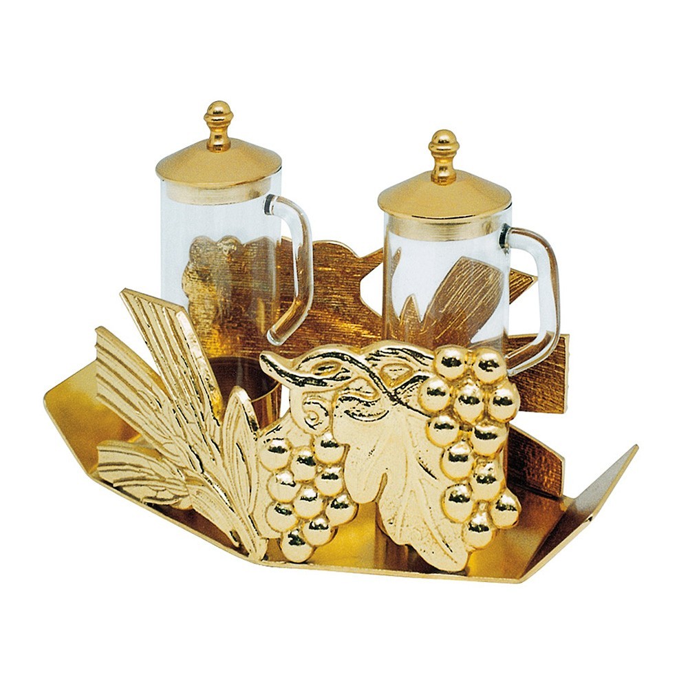Ai lati del vassoio sono riportati i simboli della Comunione: spighe di grano e grappoli d'uva. Le ampolline hanno una forma cilindrica e sono completi di manici intergrati.
