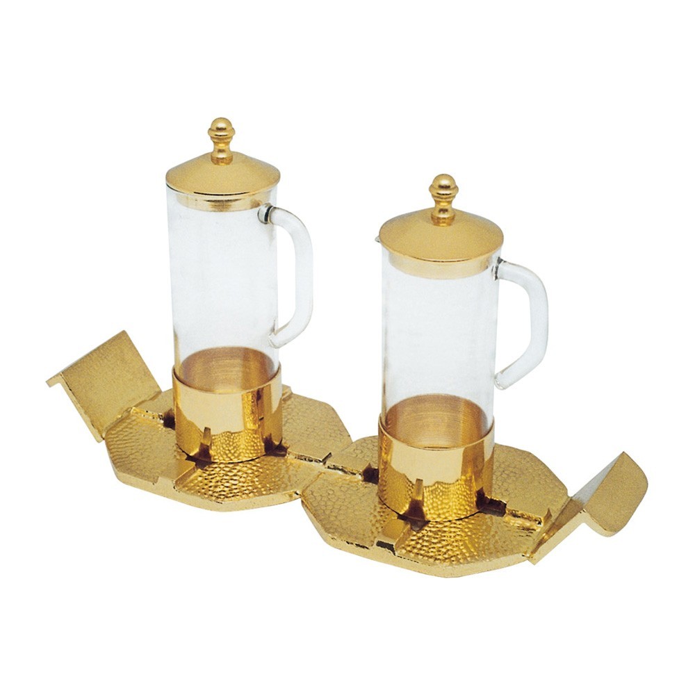 Questo servizio liturigco è composto da due ampolline in vetro con manico intergrato e vassoio in ottone. Il vassaio è finemnete decorato con due croci stilizzate.