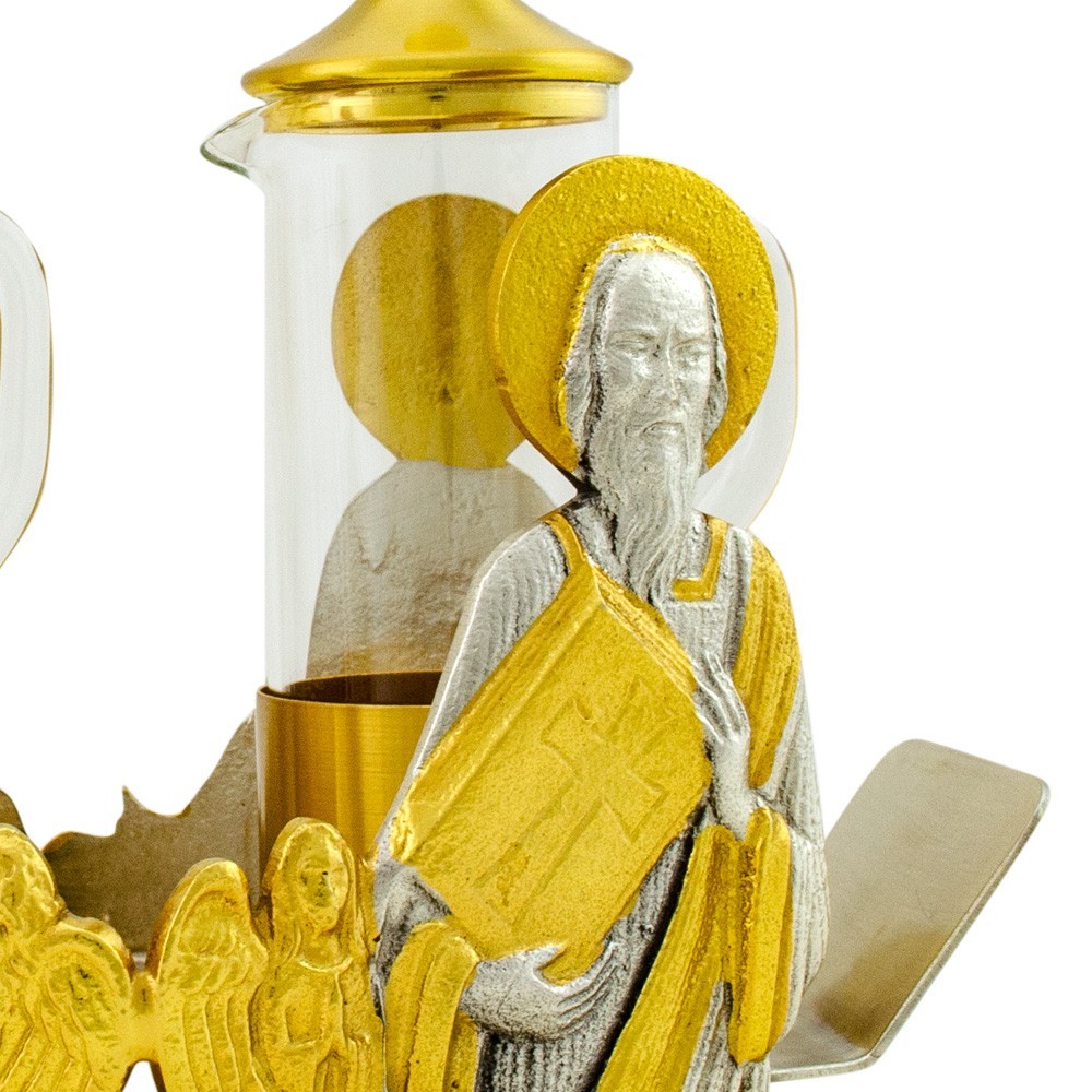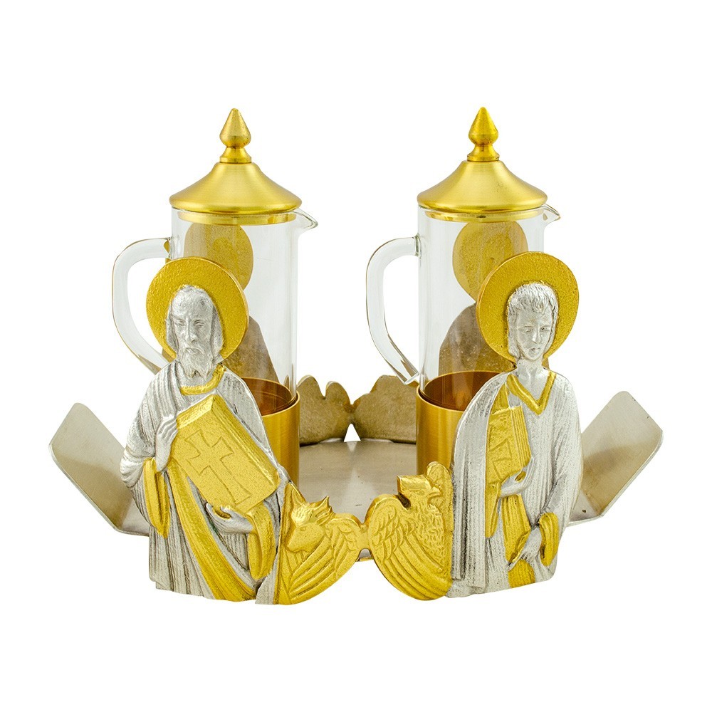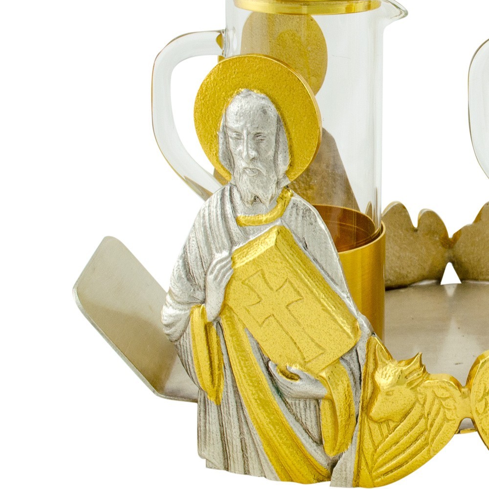 Ampolline liturgiche acqua e vino in vetro. La struttuta di appoggio e i coperchi delle ampolle sono in ottone bicolore. Sui i due lati del vassoio sono raffigurati i quattro Evangelisti.