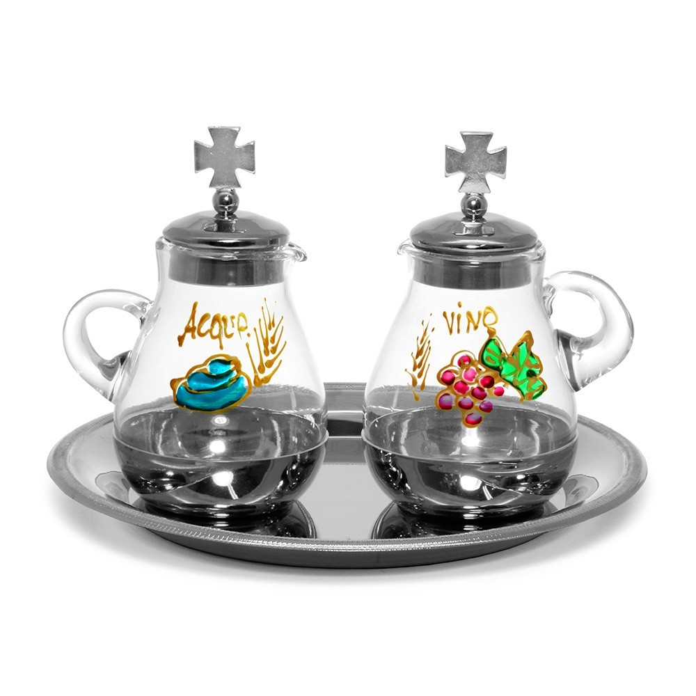 Servizio ampolle acqua e vino complete di vassoio. Queste ampolle liturgiche"Mod Bologna" sono da 110 ml in vetro, mentre i tappi e il vassoio sono in ottone. Le ampolline sono dipinte finemente a mano.