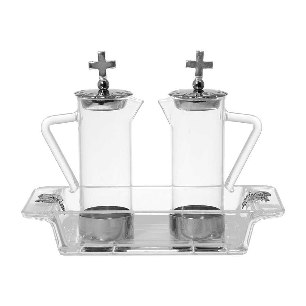 Set liturgico composto da coppia di ampolle acqua e vino per la messa complete di vassoio.