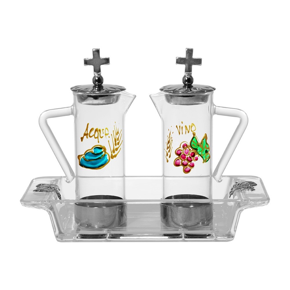 Set ampolline liturgiche acqua e vino in vetro dipinte finemente a mano.