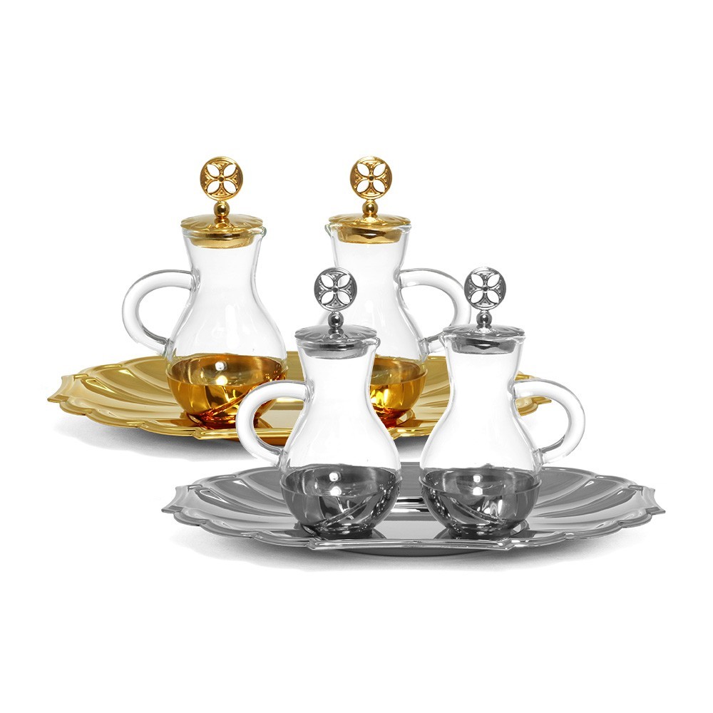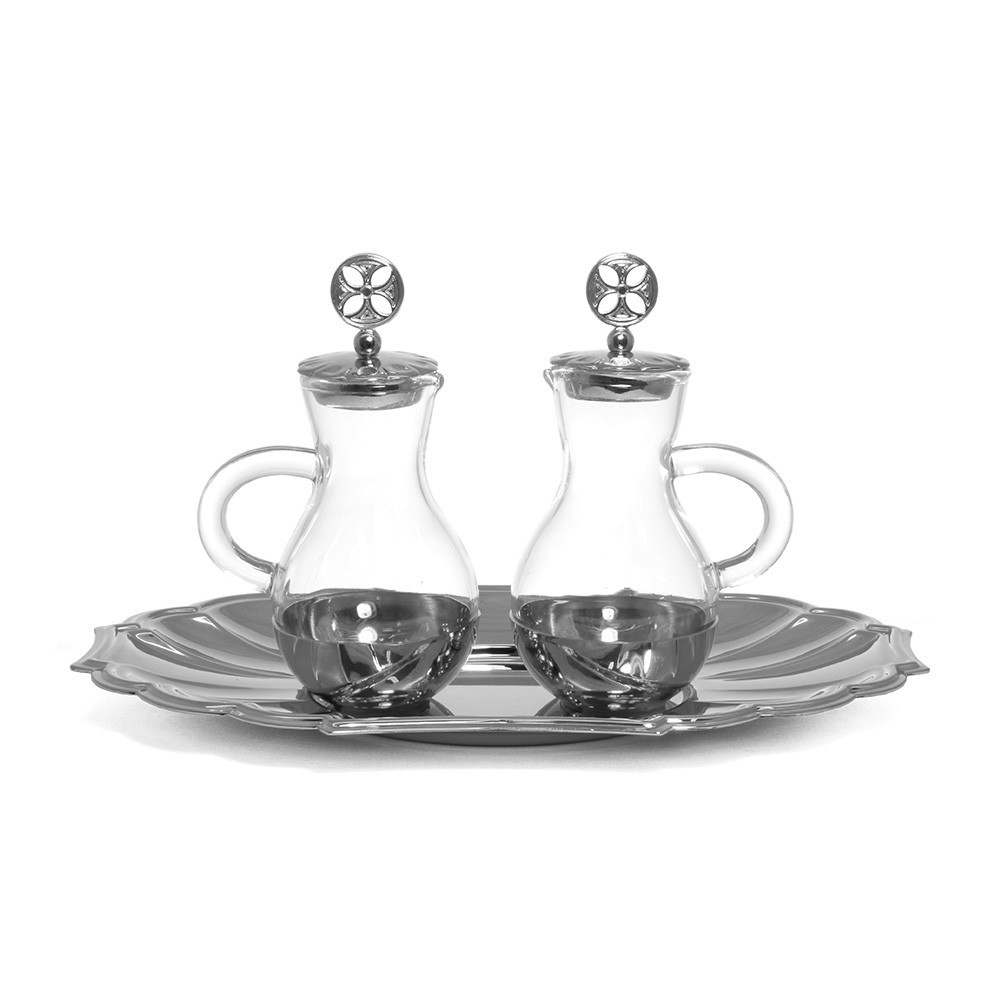 Questo set liturgico è formato da una coppia di brocchette acqua e vino con vassoio.