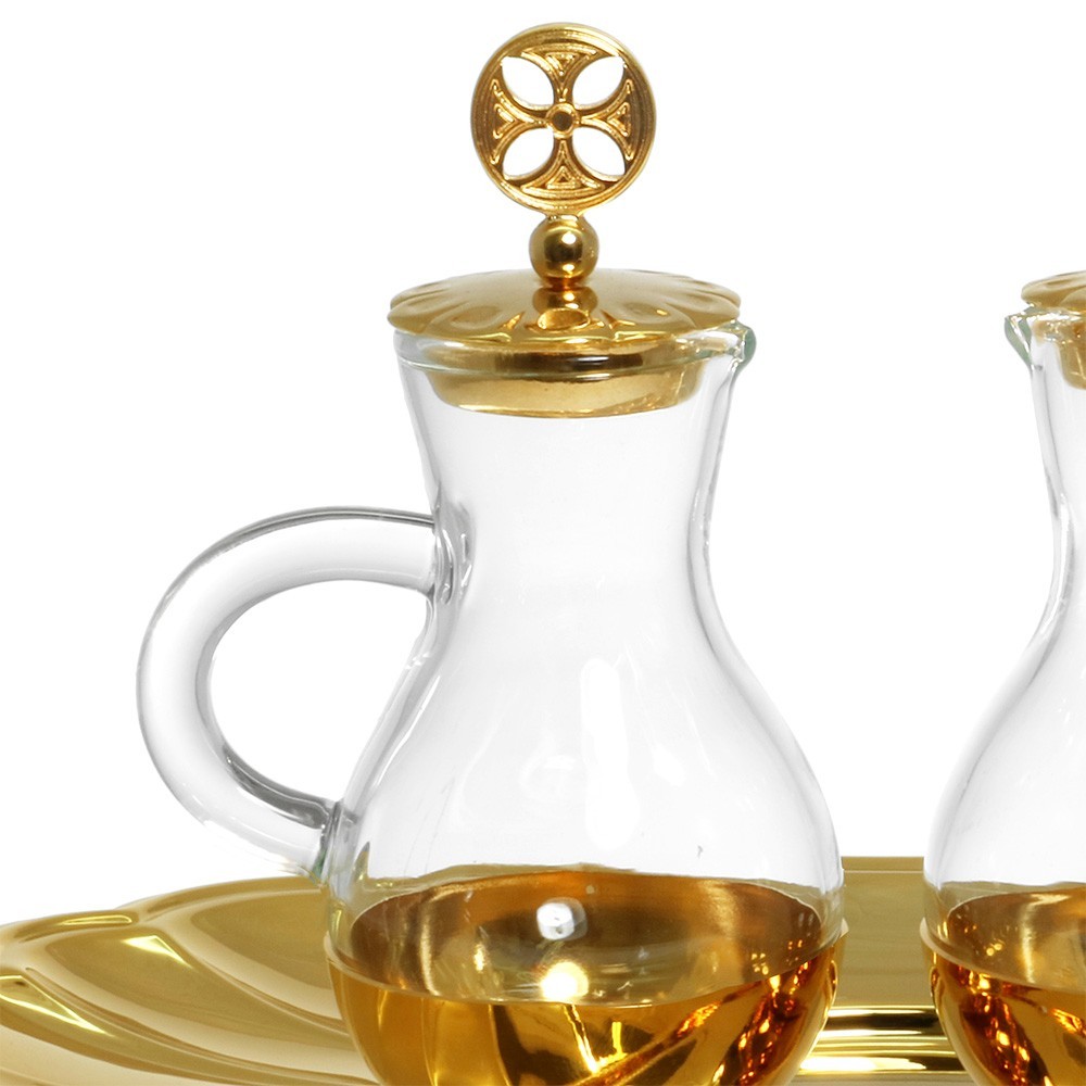 Servizio ampolline per altare acqua e vino con vassoio in ottone.