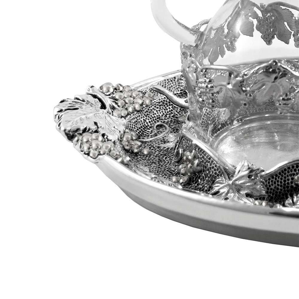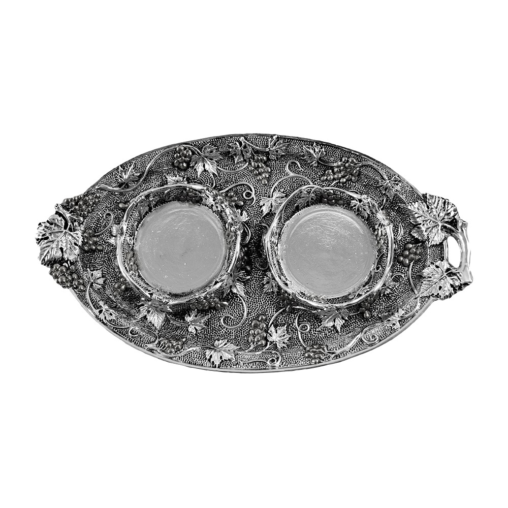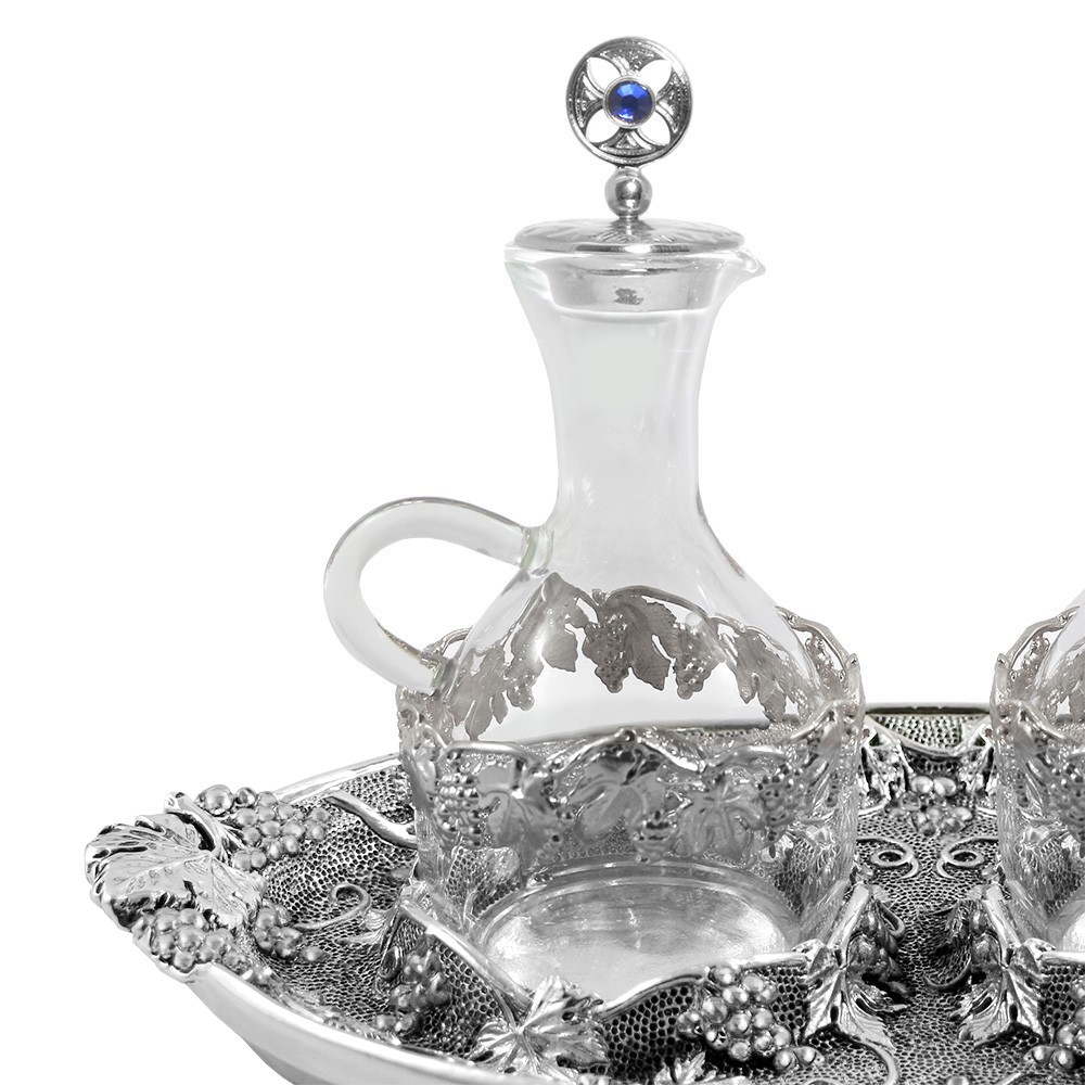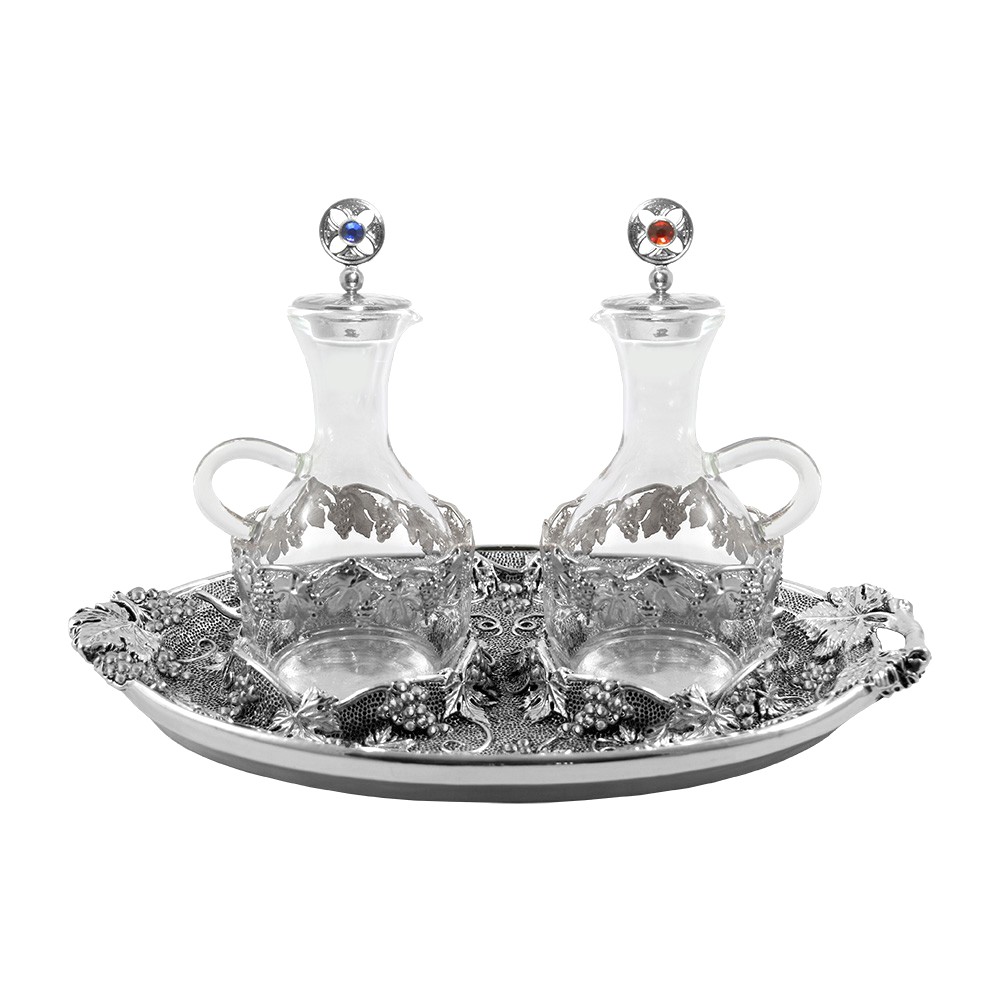 Servizio ampolline acqua e vino modello "venezia" con ghiera e completa di vassoio. Il tutto realizzate con finitura argento antico e con un particolare decoro raffigurante "Uva e Foglie di Vite".