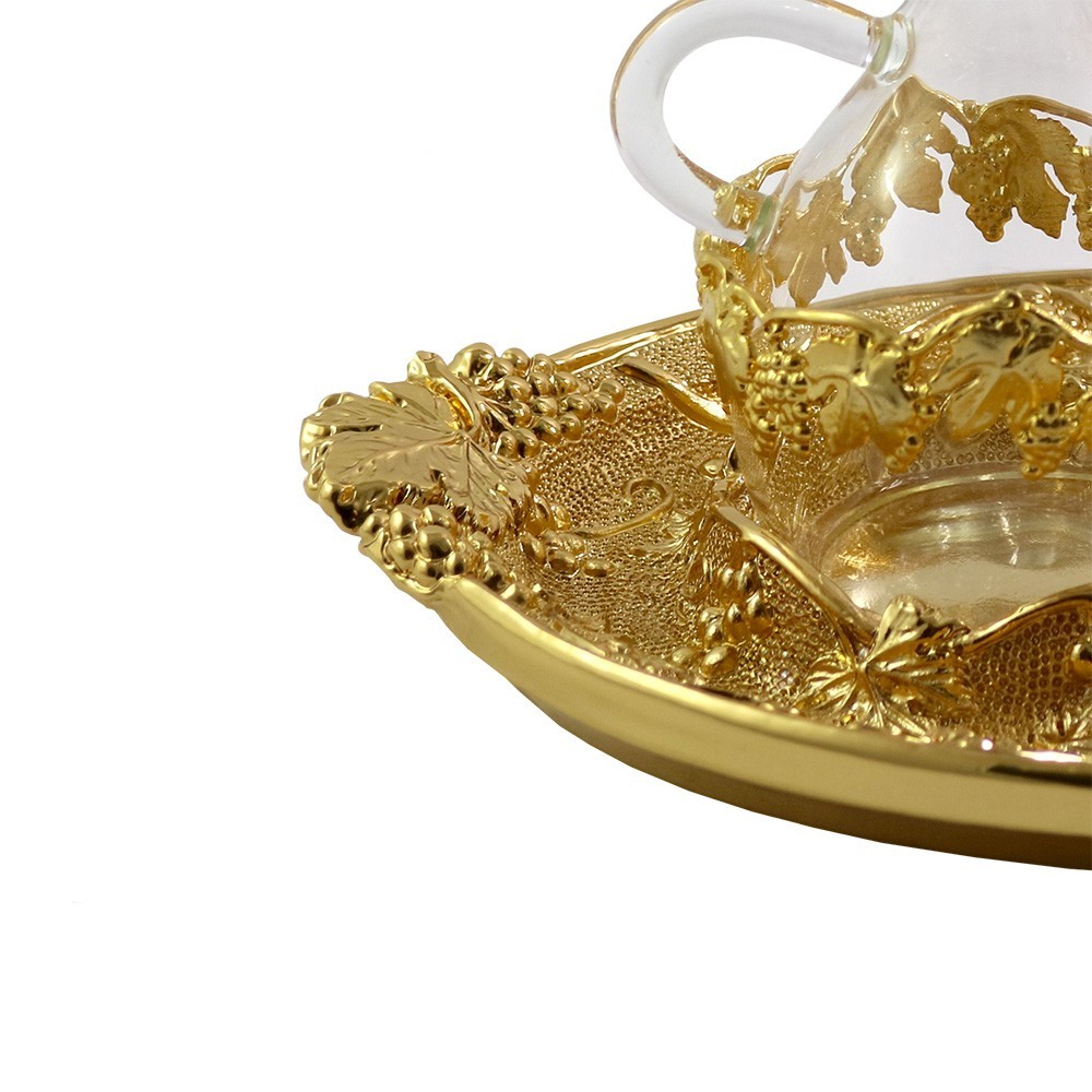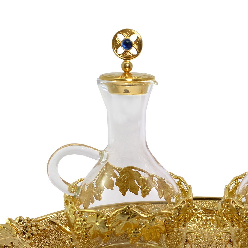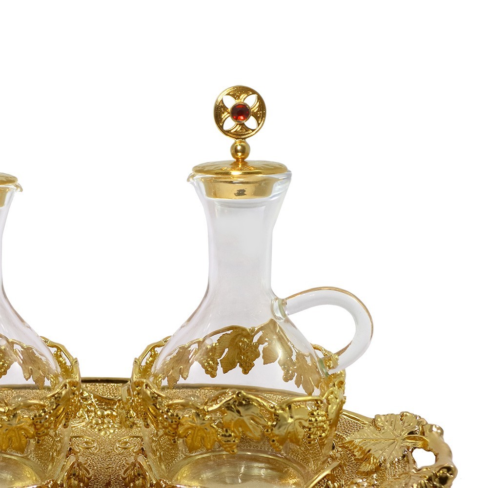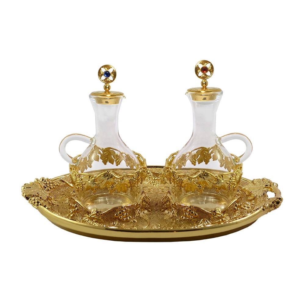 Ampolline per acqua e vino con vassoio. Le ampolline modello "venezia" sono in vetro rivestite con ghiera. Il tutto realizzate in ottone con finitura dorata con un particolare decoro raffigurante "Uva e Foglie di Vite".