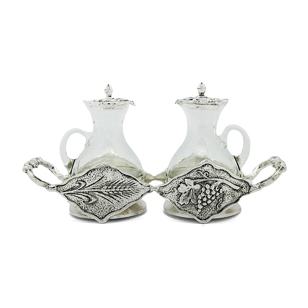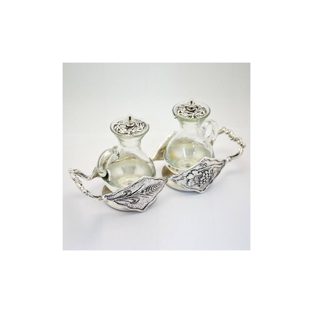 Ampolle liturgiche acqua e vino in vetro decorate a mano.