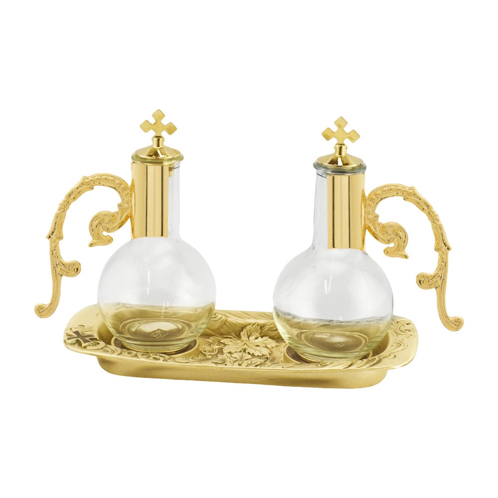 Vassoio in ottone con due ampolle per acqua e vino da 130 ml.