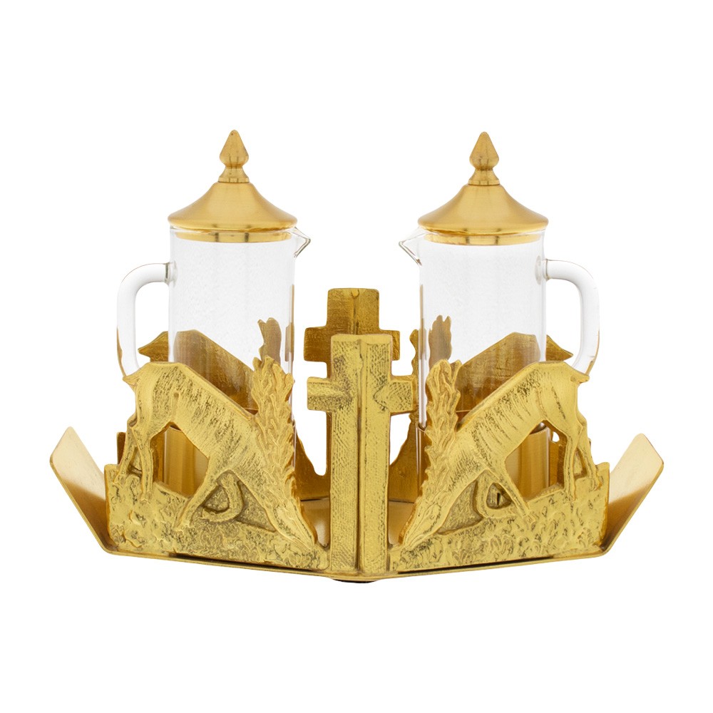 Set ampolline liturgiche acqua e vino complete di vassoio, modello "Cervi alla fonte".