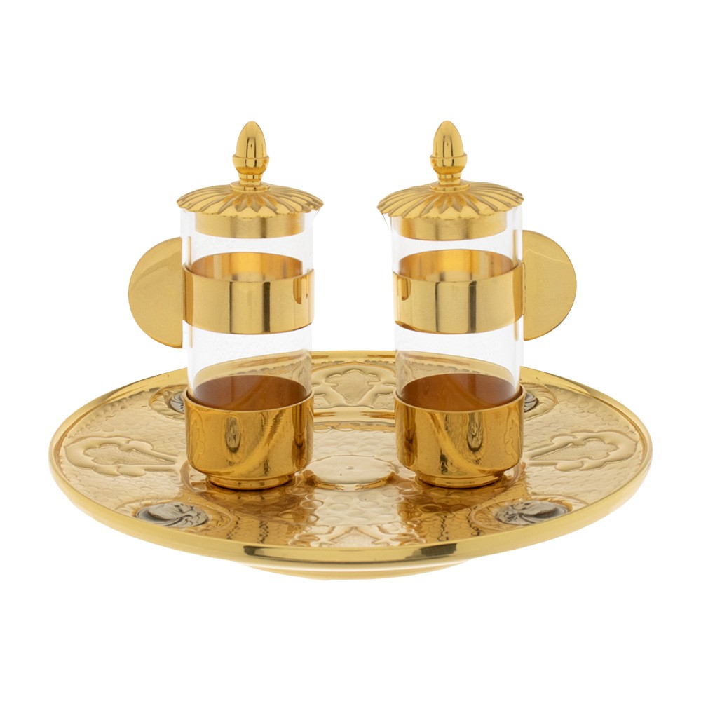 Ampolle liturgiche acqua e vino con vassoio cesellate a mano.