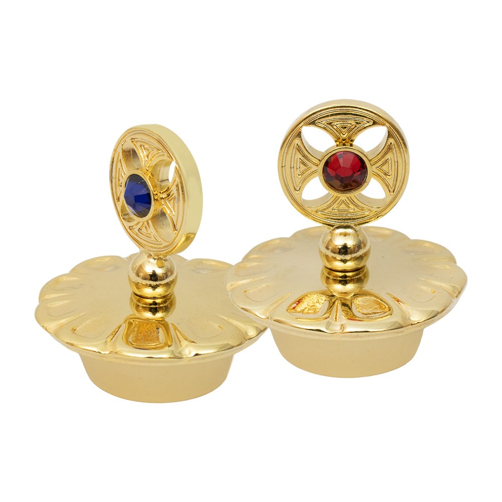 Ricambio coppia di tappi per ampolline acqua e vino in metallo con finitura dorata e pietre colorate.