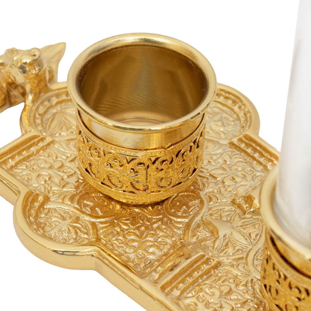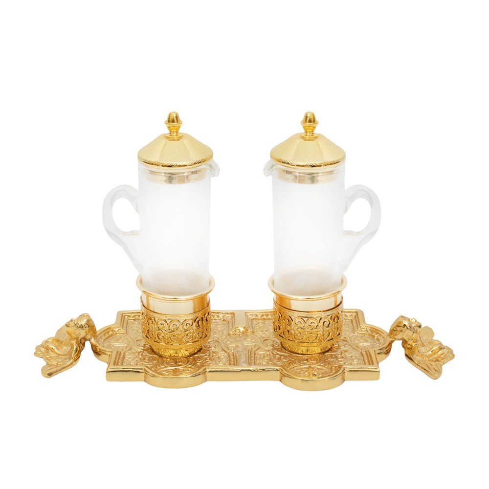 Servizio ampolline per altare acqua e vino con piatto in ottone.