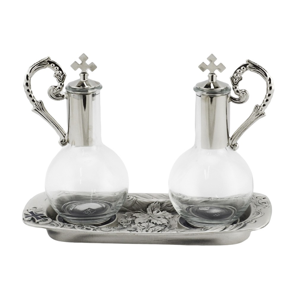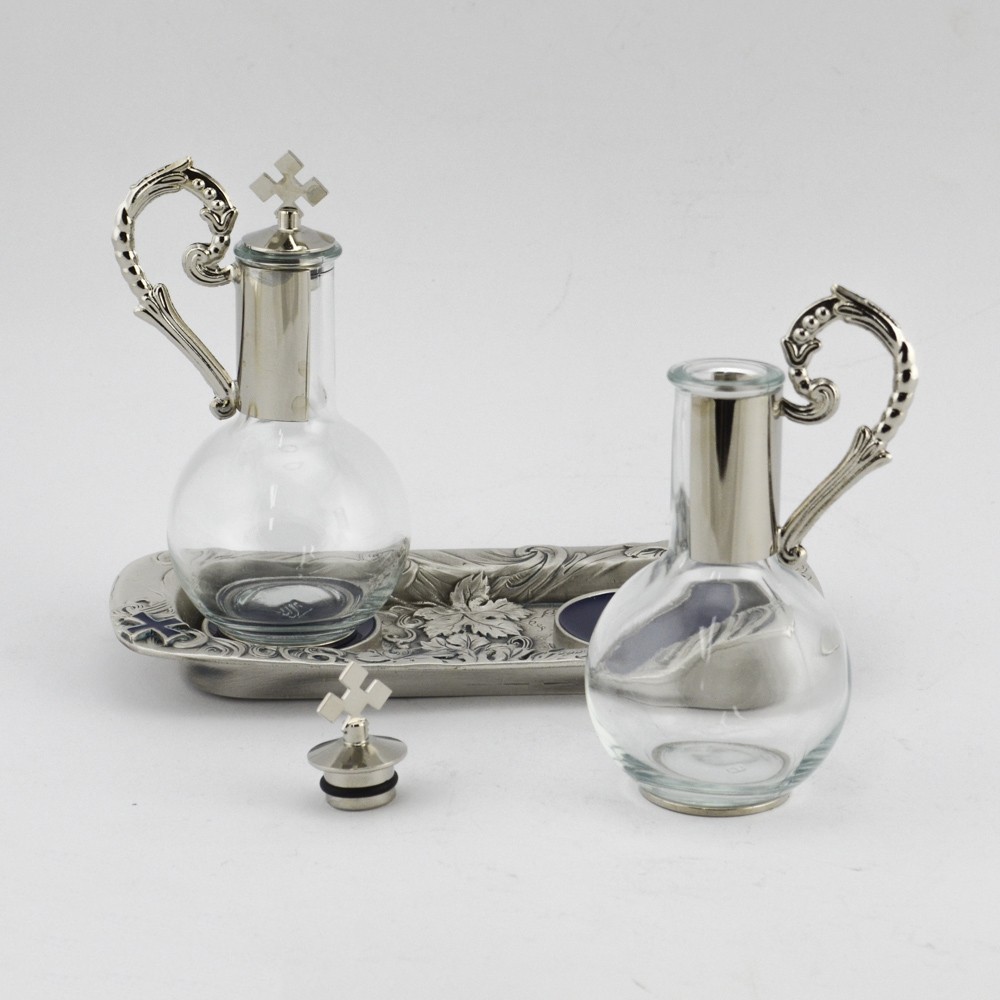 Ampolle magnetiche acqua e vino per altare realizzate in fusione peltro e ottone argentato. Sul vassoio sono incisi in rilievo i simboli eucaristici in ottone argentato. Molto funzionali e con stabilità garantita da un sistema di ancoraggio al vassoio tramite un magnete permanente. Prodotto made in Italy.