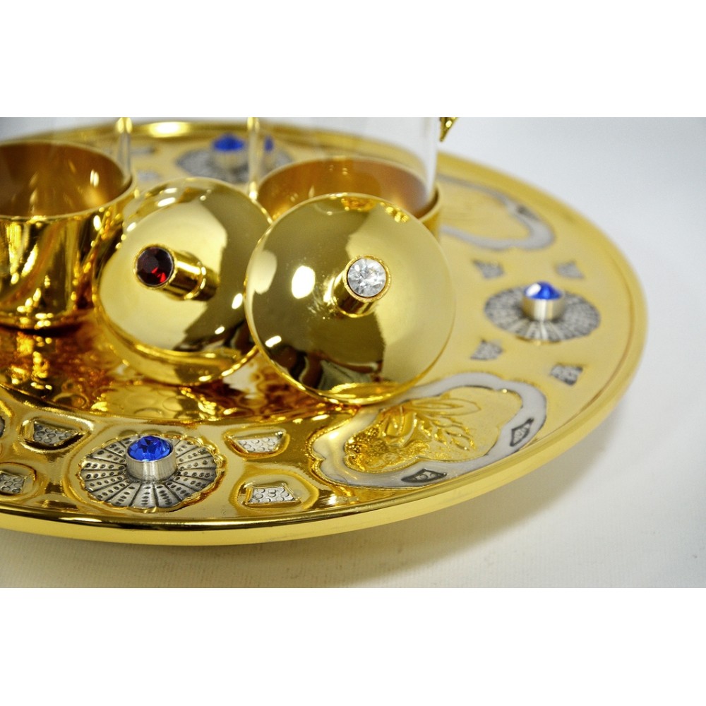 Il vassoio è interamente in ottone bicolore arricchito con applicazione di pietre.