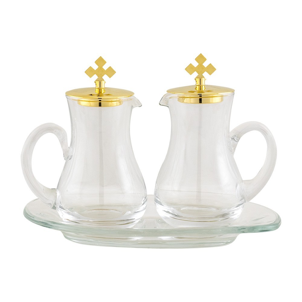 Servizio ampolline per altare acqua e vino con vassoio in ottone.