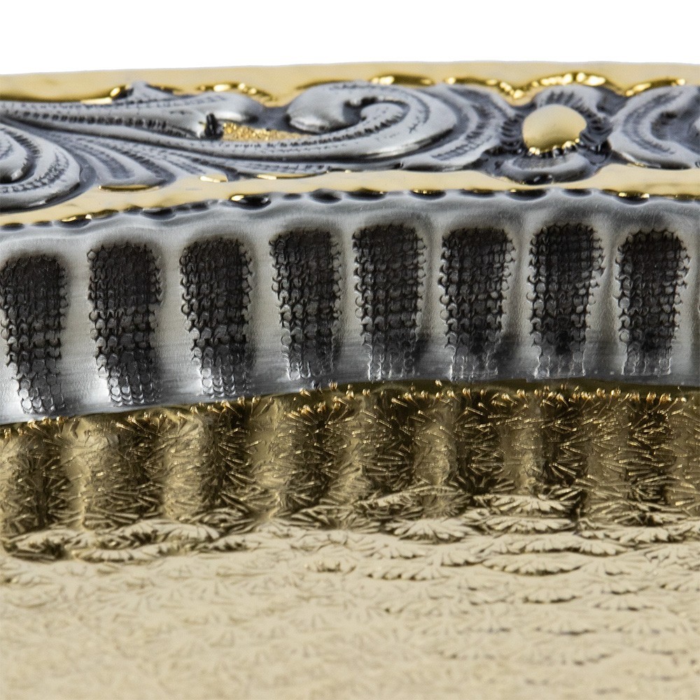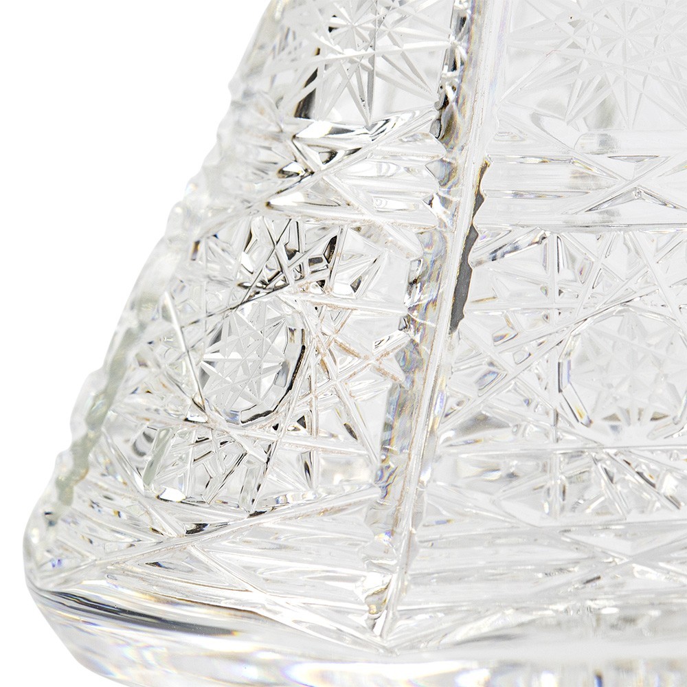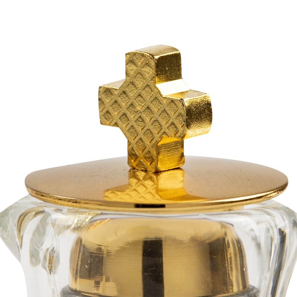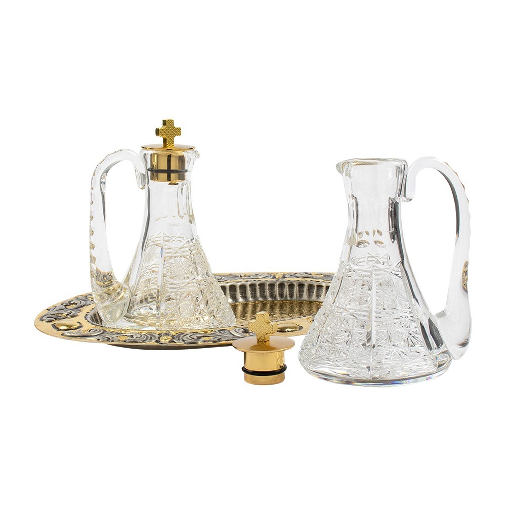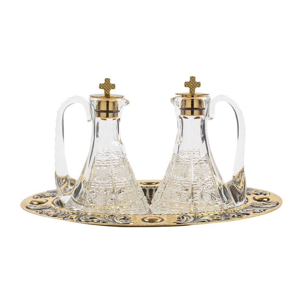 Servizio ampolle acqua e vino per la messa in cristallo di Bohemia. Il piattino è bicolore dalla forma ovale e cesellato interamente a mano. I tappi delle ampolle sono in ottone dorato.